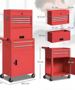 HOMCOM 5 Drawer Tool Box on Wheels, Lockable Steel Tool Cabinet with Side Handle, Red