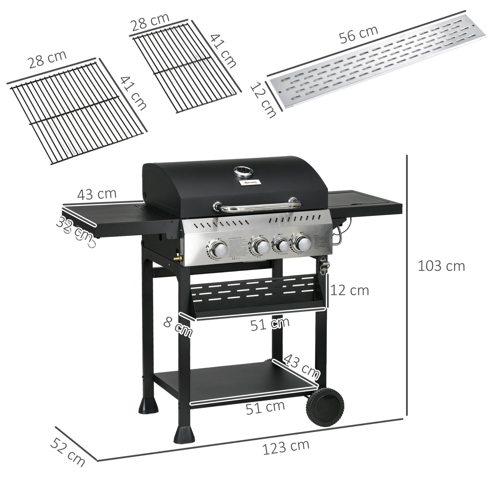 Outsunny Four-Burner Steel Gas Grill, with Thermometer – Black