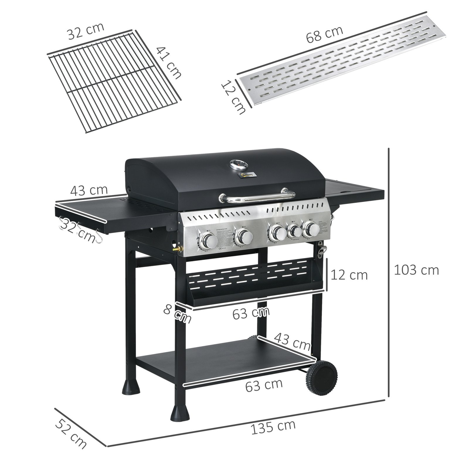 Outsunny Five-Burner Steel Gas Grill, with Thermometer – Black