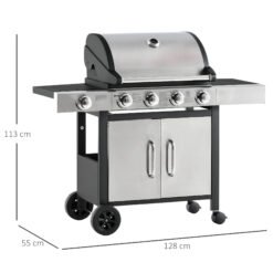 Outsunny Gas Barbecue Grill 4+1 Burner Garden Smoker BBQ Trolley w/ Side Burner Warming Rack Side Shelves Storage Cabinet Piezo Ignition Thermometer Stainless Steel + Metal