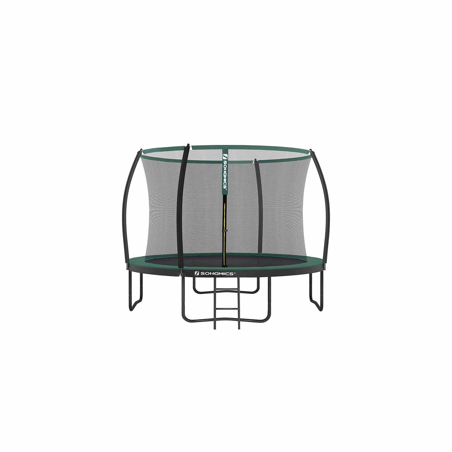Fun in the GardenThis 10 ft (305 cm) trampoline is the perfect way to have fun on a warm afternoon (and maybe even sneak in a little workout). Let your children safely bounce to their heart’s content with this SONGMICS trampoline while you enjoy gardening or getting ready for a delicious barbecue.Above All, Safety MattersWhile it’s important to have fun, it’s even more important to keep safe. This 10 ft trampoline was designed with a dense inner mesh that is more resistant to impacts and reduces the chance of hitting the poles on the outside. The arch poles are covered with a EPE foam for even more safety.Specifications:- Colour: Black, Dark Green- Size: 10 ft (305 cm) Dia.- Material of Base: Galvanized Steel Tubes- Material of Jumping Pad: Polypropylene (265 g/m²)- Material of Safety Pad: PVC (310 g/m²) + EPE Foam- Height Between Base and Floor: 76 cm- Max. Load Capacity: 150 kgPackage Contents:- 1 x 10 ft Trampoline- 1 x Ladder- 1 x Accessories Kit- 1 x Instructions (EN, DE, FR, ES, IT)SONGMICS Notes:- Only one person should use the trampoline at a time. More than one person can result in injury.- Do not attempt somersaults on the trampoline.- Do not hang on the top bar of the trampoline net.- Remove all sharp objects before going on the trampoline.- Not suitable for children under 3 years old.- For home use only.