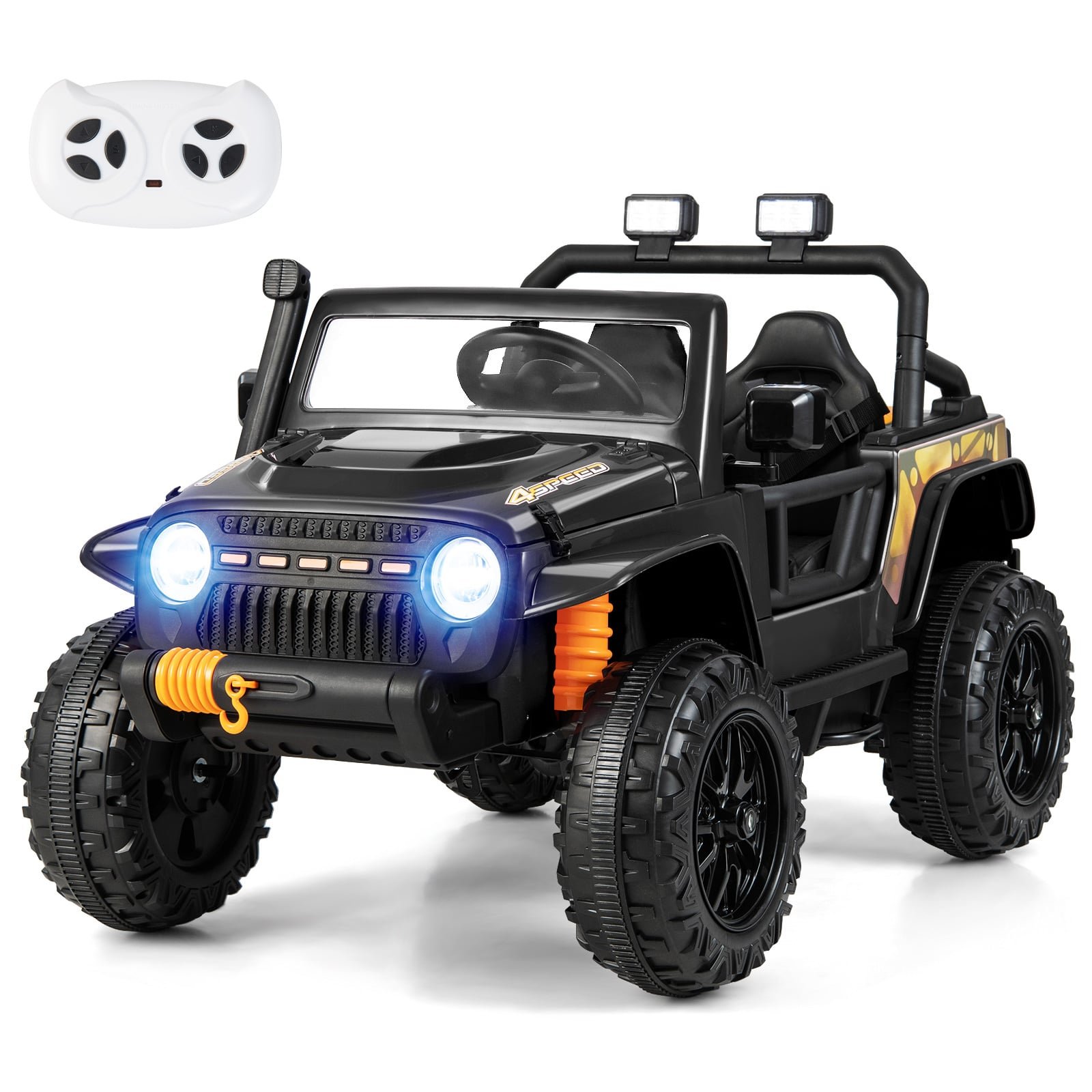 A parent can easily control this 12V battery-powered car with the steering wheel and foot pedal, while parents can also operate it with the remote control. The remote control is designed with a slow start system for more safety. And these premium wheels are equipped with a spring suspension system for smooth riding. Meanwhile, 2 powerful motors and a 12V battery offer a speed of 2-3 mph. Besides, this ride on the truck also has a unique parent-child function, allowing parents to better accompany their kids. To bring toddlers endless fun, this vehicle features an openable hood, a fun horn button and bright searching lights. Kids are also allowed to store items in its hidden storage. Apart from that, dual lockable doors, backrest design and safety harness ensure a safe driving experience. It has passed ASTM and CPSIA certifications. Cool and Realistic Ride on Truck: 2 powerful motors ensure a 2-3 mph speed range. And this vehicle possesses 4 anti-slip and wear-resistant wheels with suspension springs. Thus, this kid’s ride-on cars is suitable for different road conditions, such as wood floors, brick roads, cement roads, asphalt roads, etc. Besides, the openable hood and bright searching lights also make kids feel like driving a real truck. Unique Parent-Child Mode: The unique adult mode helps to promote parent-child interaction and better protect kids’ safety. Parents should remove the light bar and detach the rear trunk box and cover. Then, parents need to turn over the trunk box, replace the rear trunk box and cover, as well as pull out the adult foot pedals. After that, parents can use use the throttle button to enjoy riding with their toddlers. Manual Operation and Remote Control: This 12V kids’ ride-on car is designed with two operation modes: kids’ manual control and parental remote control. Kids can fully operate it with a steering wheel and throttle pedal. Meanwhile, parents can use the 2.4G remote control to directly move it forward/ reverse, turn it left/ right, adjust its speed, or brake in an emergency. Safe Design and Hidden Storage: Slow start system of the remote control to avoid sudden acceleration. Dual lockable doors, backrest design and safety harness provide kids with multiple safety protection. ASTM-certified and CPSIA-certified, this truck is super safe for kids to use. In addition, hidden storage space enables kids to store their toys or snacks. Perfect Festival Gift for Your Kids: By pressing the sound/ horn button of the steering wheel, kids can acquire more fun. Made of PP and steel materials, this ride-on vehicle is strong and durable enough to accompany toddlers’ growth and offer them unforgettable childhood memory. Therefore, it is an ideal gift for kids’ birthdays or other meaningful festivals.
