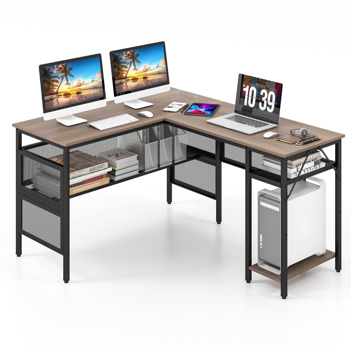 Colour: Gray Wash Material: Engineered Wood, Metal Product Size of Table on the Left Side: 120 x 50 x 74 cm (L x W x H) Product Size of Table on the Right Side: 140 x 50 x 74 cm (L x W x H) Dimension of Mesh Shelf: 112 x 20 cm (L x W) Height Between Tabletop and Shelf: 13 cm Dimension of CPU Stand: 22 x 47 x 47 cm (L x W x H) Rating: 12A 125V, 60 Hz, 1500W USB Port: 5V Max. 2.1A Power Cord Length: 200 cm Net Weight: 30 kg Weight Capacity of Tabletop: 150 kg Weight Capacity of Large Mesh Shelf under Tabletop: 30 kg Weight Capacity of Small Mesh Shelf under Tabletop: 20 kg Weight Capacity of CPU Stand: 20 kg Box Qty:1(May vary by batch)Package Includes: 1 x L-shaped Computer Desk 1 x Instruction