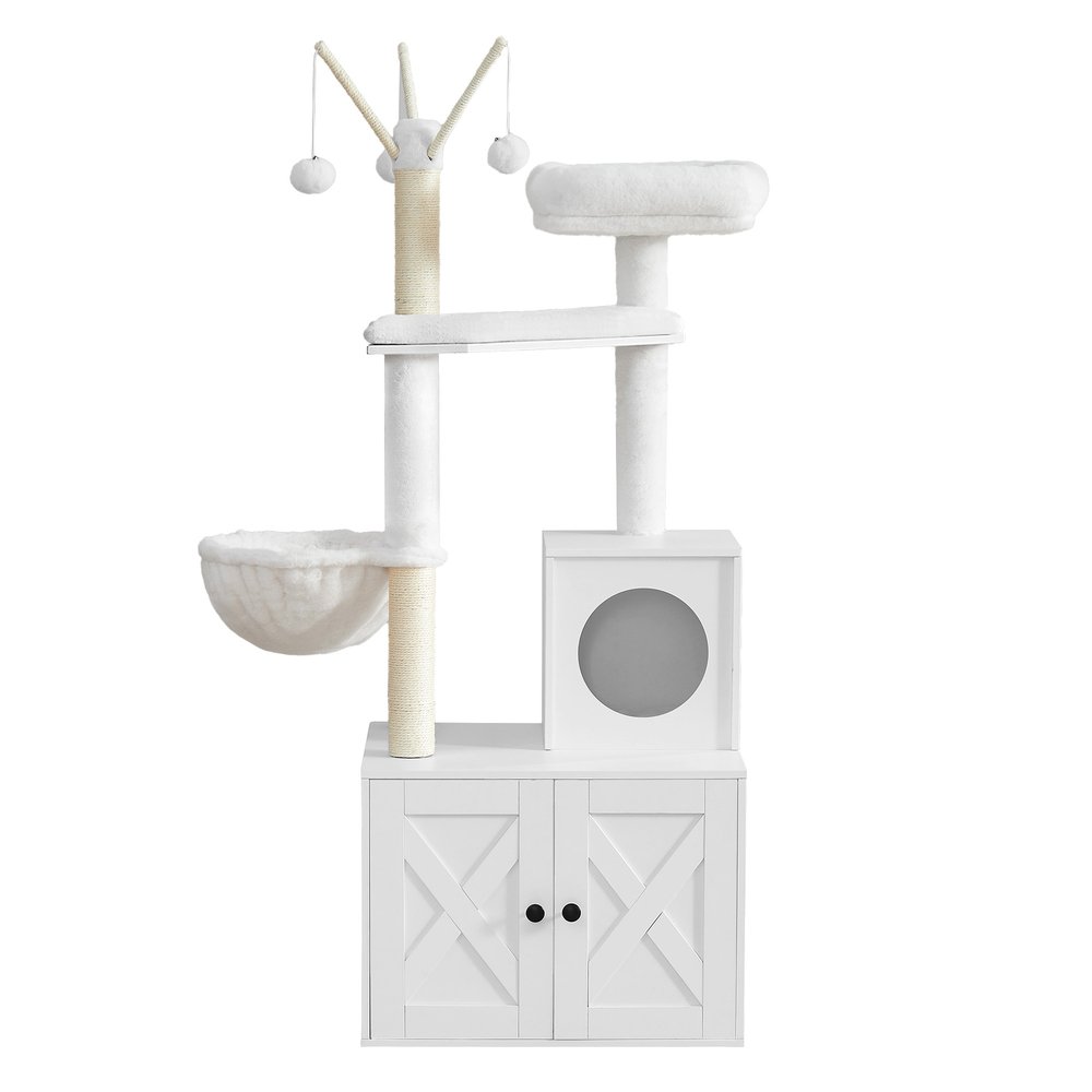 Feandrea WoodyWonders Cat Tree with Litter Box Enclosure, 2-in-1 Modern Cat Tower, Cat Condo with Scratching Posts, Removable Pompom Sticks, Washable Cushions, Cloud White PCT113W01