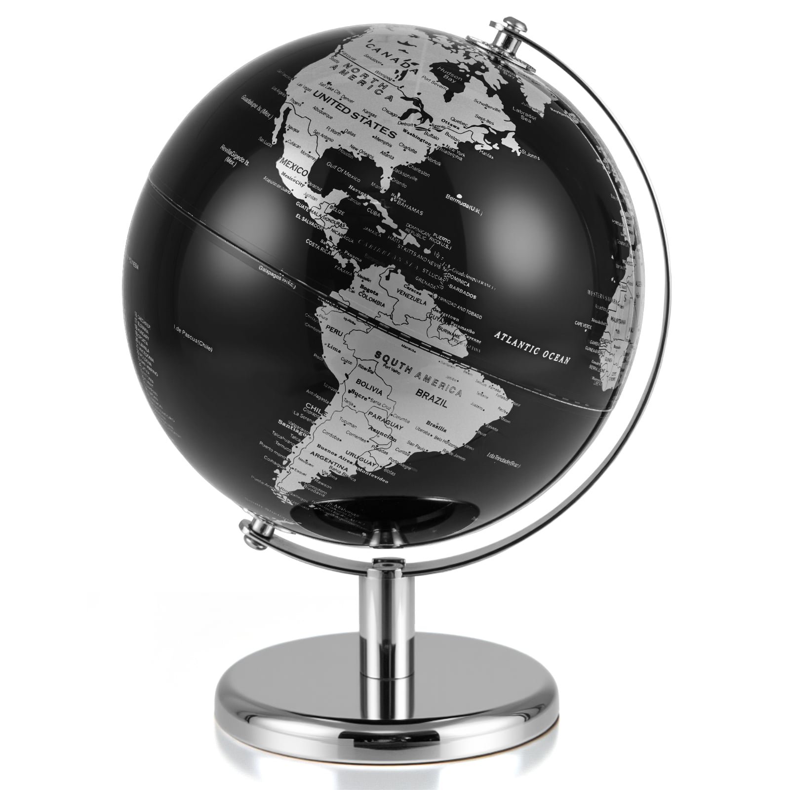 20CM Rotating Metallic Black World Globe with Metal Stand for Home School-Silver