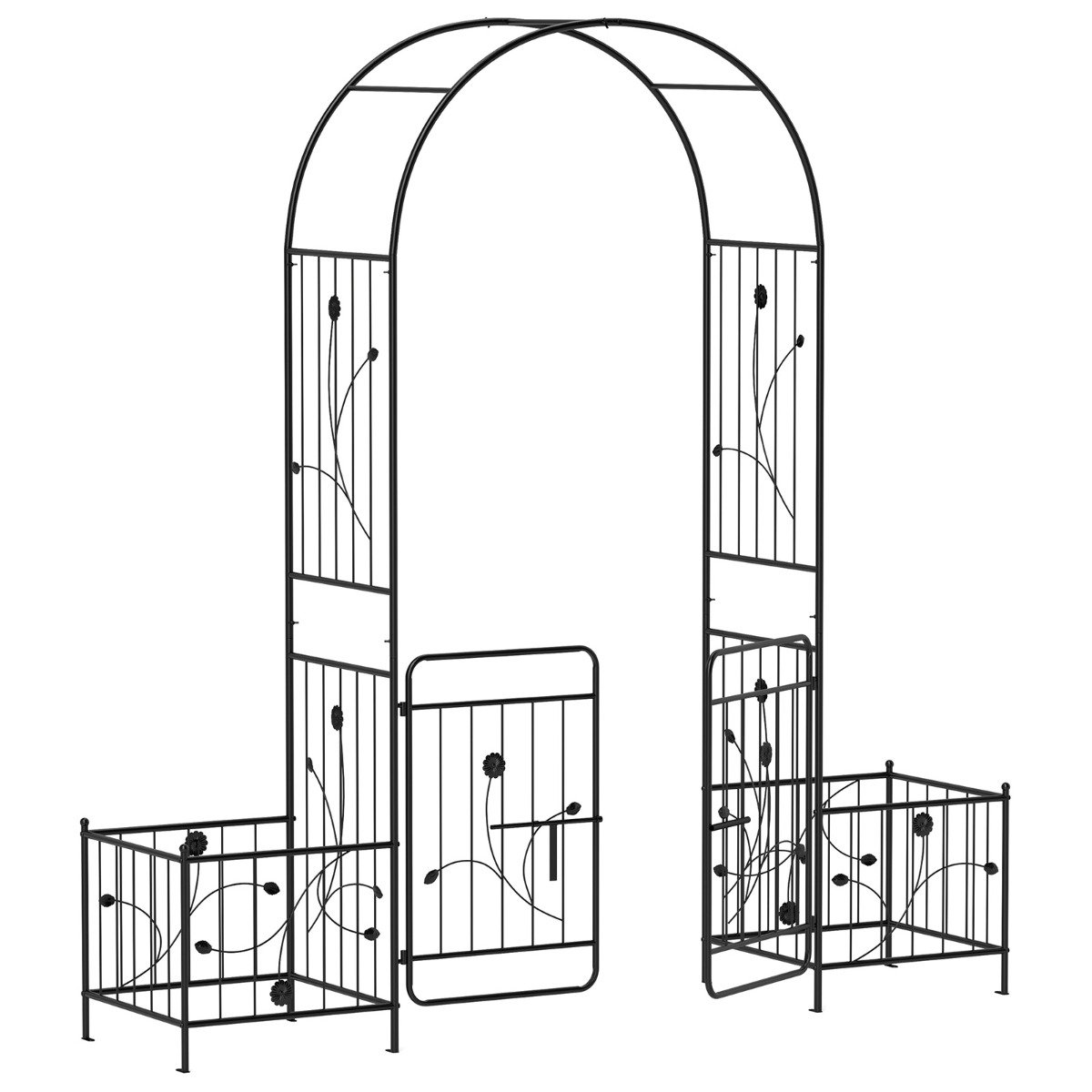 220cm Garden Arbor Metal Arch Trellis Lockable Gate with Side Planters-Black