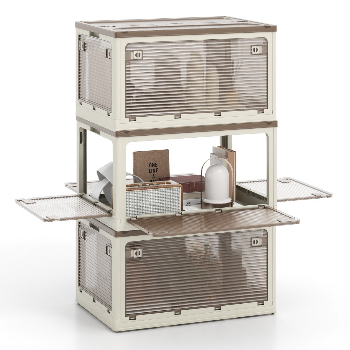 Effortlessly organize your space with the stackable storage bins. With a large storage capacity, these bins are perfect for storing clothes, toys, books, snacks, and more. The 5 opening ways design also allow you conveniently fetch your belongings from multiple directions. Each storage box is equipped with wheels on the bottom, allowing for easy mobility and standalone use. It also features a collapsible design that not only saves space but also makes installation a breeze. Moreover, the embedded receptacles for desiccant or insect repellent provide added protection for your belongings. Upgrade your storage solutions with these versatile and practical storage containers! Five Opening Ways: Featuring top lids and convenient flap-down doors on all four sides, our stackable storage bins offer 5 opening options for easy access from multiple angles . Moreover, door latches on all sides provide added security for your belongings. Stackable and Movable Design: These plastic storage boxes with lids feature grooves on the top that align with wheels, allowing for easy and secure stacking. With wheels on the bottom, these storage bins can be effortlessly rolled on hard surfaces and utilized as individual units. Foldable Design and Easy Setup: No tools are required for assembly, and you can simply unfold and set up the bins in seconds. When not in use, the storage containers can be folded down for compact storage, saving valuable space in your home. Multipurpose Storage: Boasting a spacious capacity of 292 L, our plastic bins are ideal for storing clothes, books, snacks, and more. These versatile containers offer efficient organization solutions for your living rooms, closets, bathrooms, kitchens, and are also suitable for car trunks when camping. Translucent Visibility: The semi-transparent design of our collapsible storage bins with lids allows you to easily see the contents without having to remove the lids. This makes it effortlessly to locate and retrieve items from any angle.