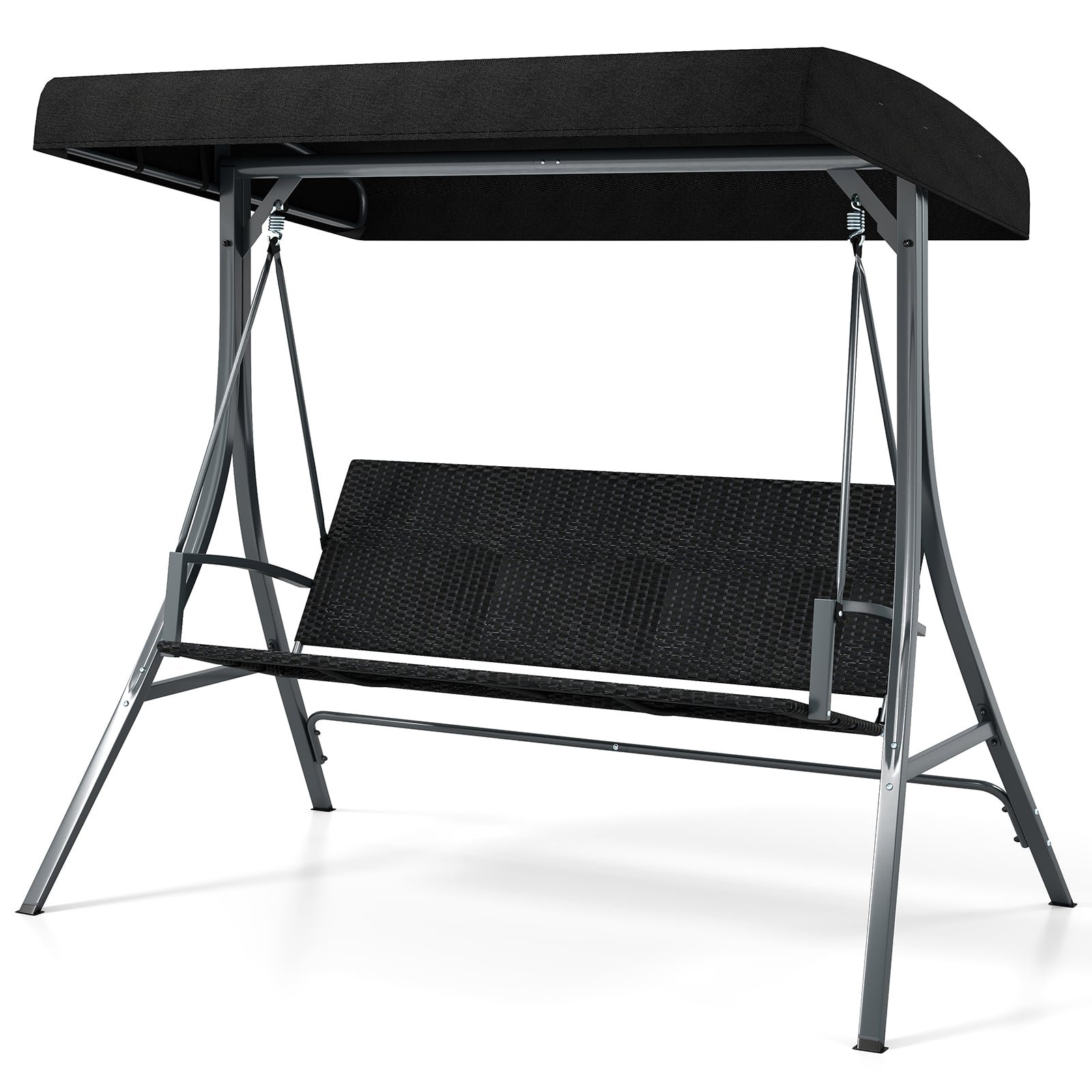 3-Person Porch Swing with Stand Adjustable Canopy Swing with Rattan Seat-Black
