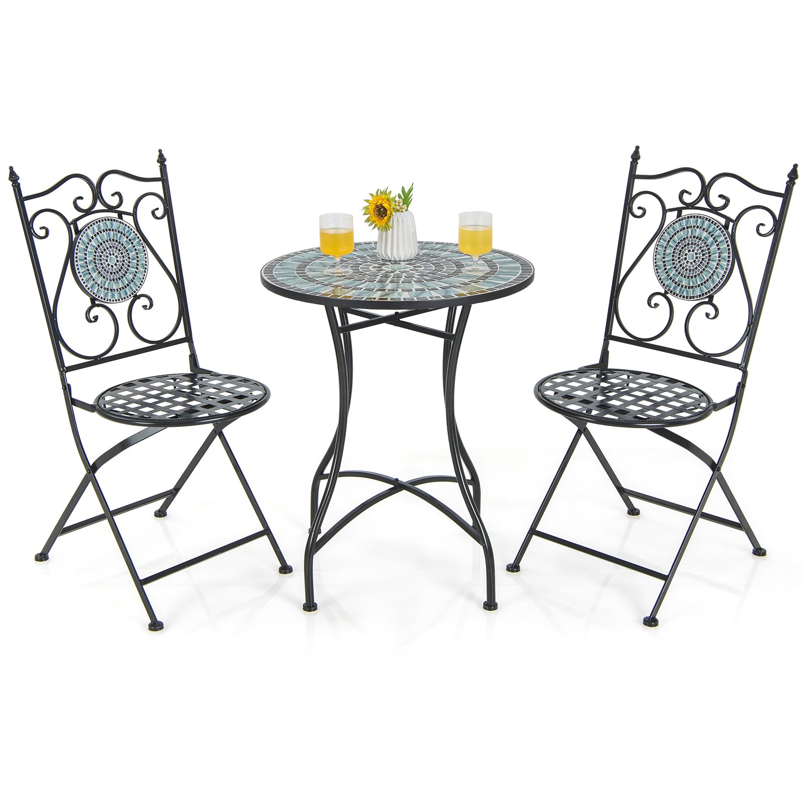 3 Pieces Patio Bistro Set Mosaic Pattern Metal Dining Set Folding