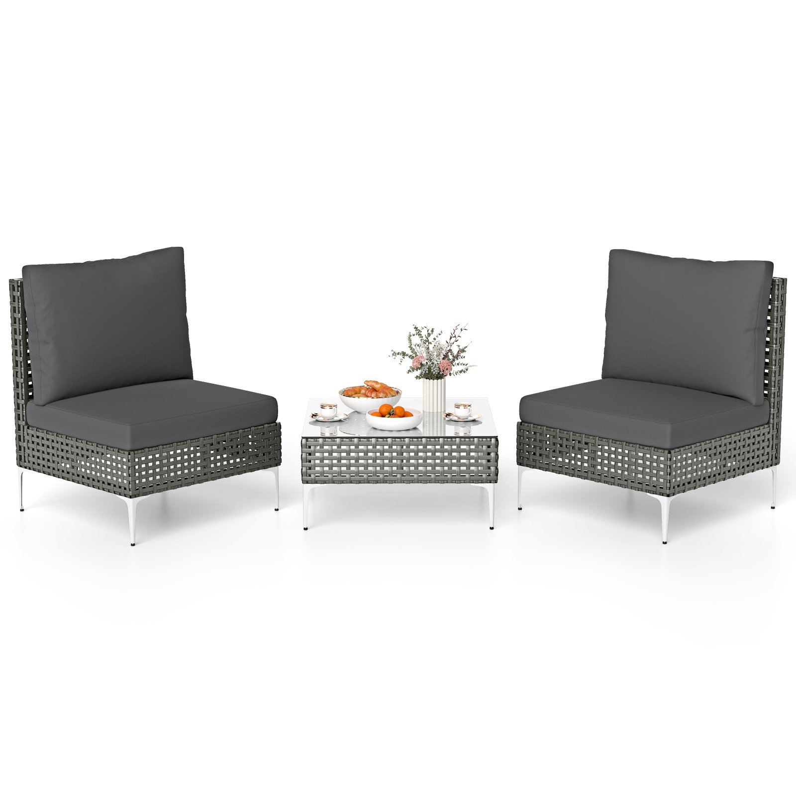3 Pieces PE Rattan Conversation Chairs with Tempered Glass Coffee Table for Garden Porch-Grey