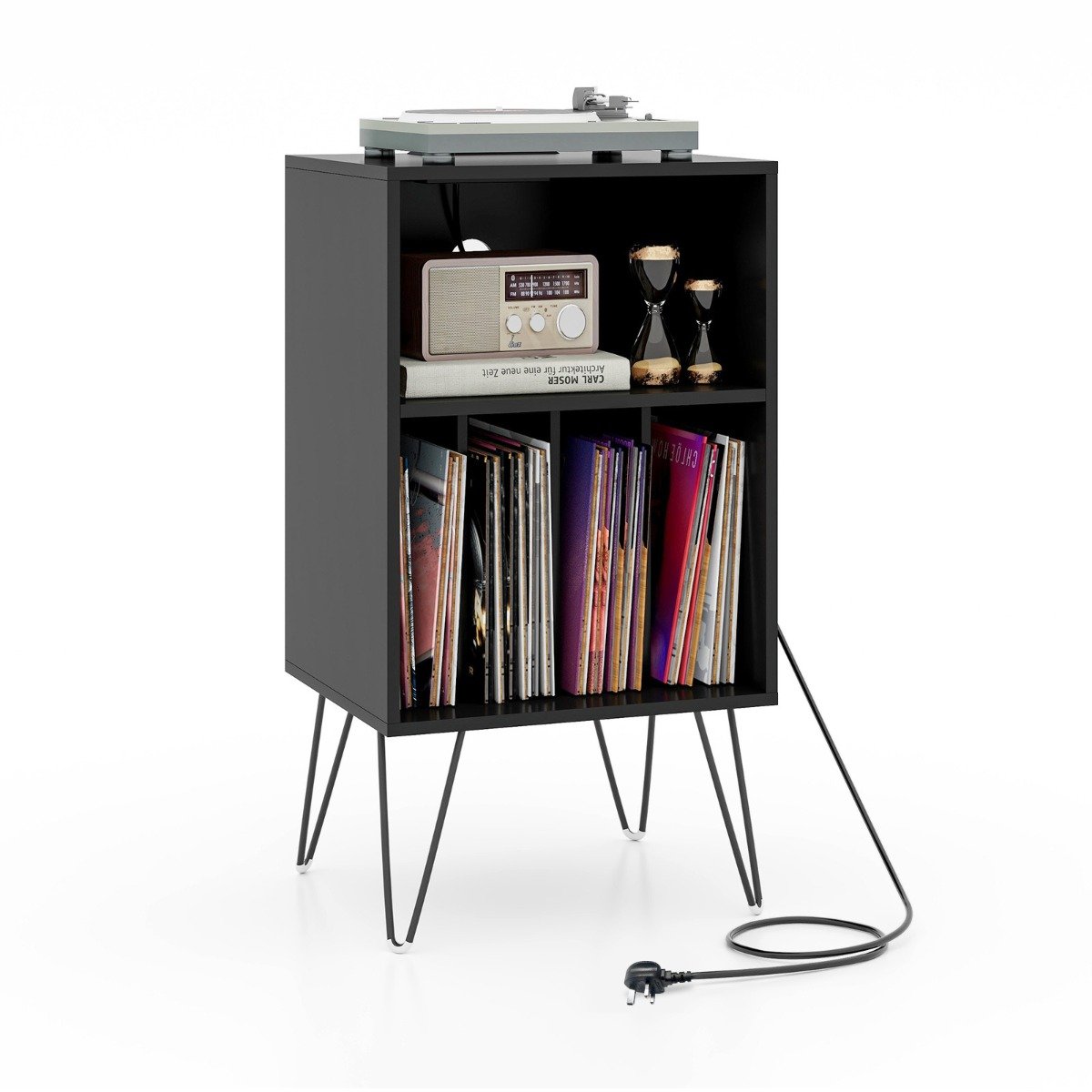 3-Tier Record Player Stand with Charging Station Shelf and 4 Dividers-Black