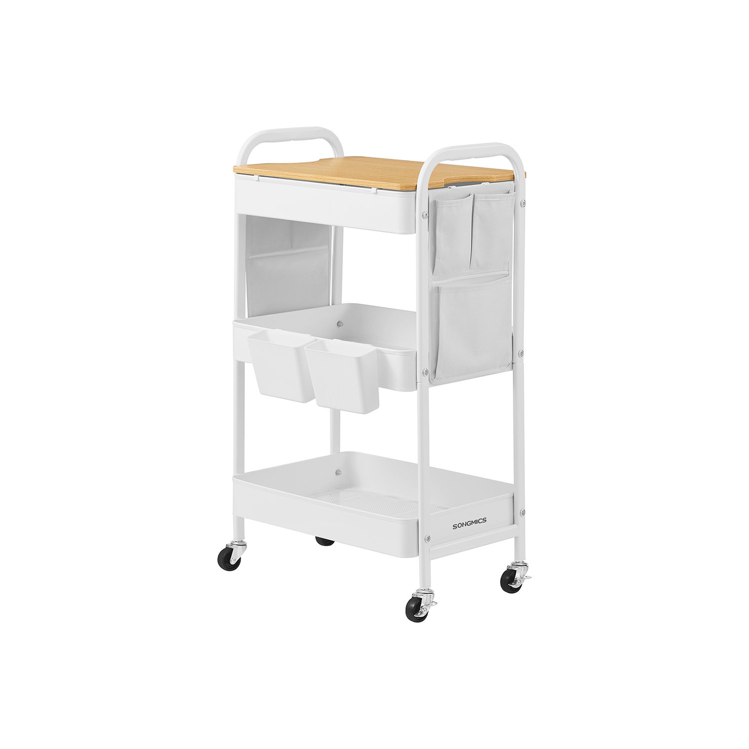 SONGMICS 3-Tier Storage Trolley, Rolling Cart with Table Top, 2 Removable Hanging Cups, 6 Side Pockets, Utility Cart for Living Room, Office, Kitchen, Bathroom, Cloud White LRC036W01
