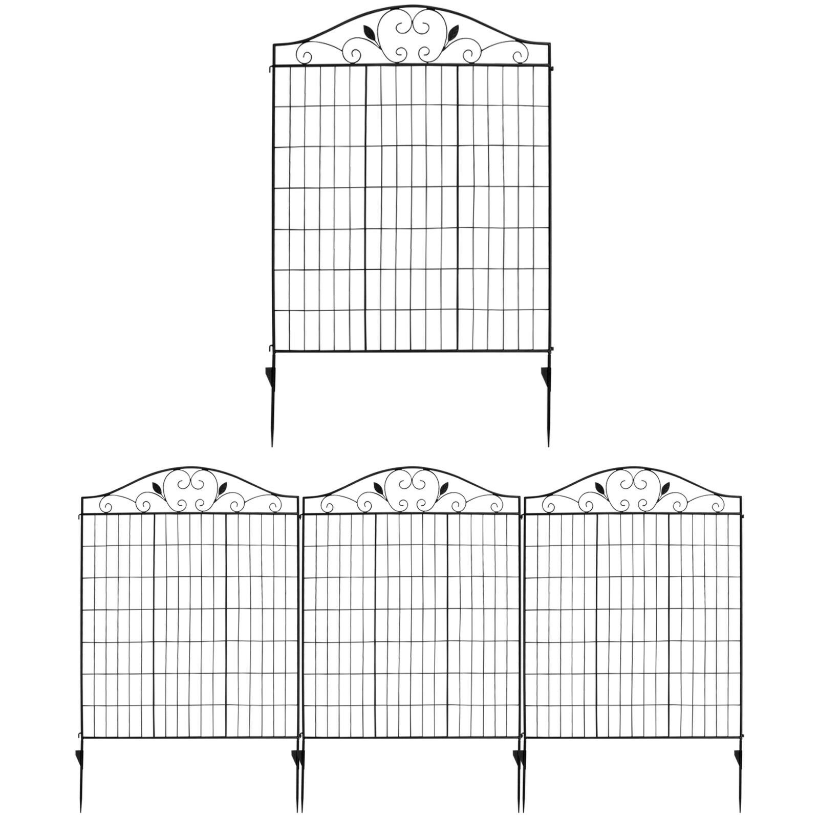 Define your lawn and garden with these decorative iron garden fences! These iron fences are deeply stuck into the soil to deal with the wind conditions. The refined patterns make a bunch of boring pieces of iron pipes into gorgeous decorations in your back yard. This set of wire barrier fences is easy to install and set up without any digging messes. Available in 4 panels and more to form various boundaries configurations at your will, also work as plant stands. Extra Tall design copes with harassment of medium size dogs. Your ideal choice of iron barrier panels. Do not hesitate to get it now! Interlock each panel easy and quick. Tall height to block most uninvited guests Insert deeply into the soil with special stakes Lightweight sectional design for easy-stowing Features artful patterns to bring elegant charm Rigid against harsh outdoor elements, rust-proof Create boundaries and barriers on your patio, lawn, and yard The robust iron frame is rust-proof with lasting durability