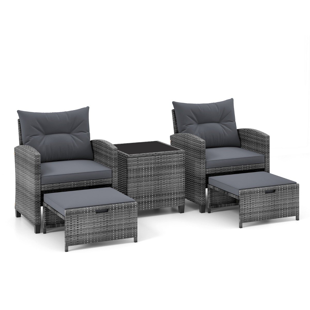 Color of Cushion: Grey Color of Rattan: Mix Grey Material: PE Rattan, Metal, Tempered Glass, Polyester, Sponge Dimension of Chair: 65 x 67 x 76 cm (L x W x H) Dimension of Ottoman: 53 x 50 x 28 cm (L x W x H) Dimension of Coffee Table: 50 x 50 x 50 cm (L x W x H) Dimension of Seat Cushion: 55 x 50 x 8 cm (L x W x Thickness) Dimension of Back Cushion: 60 x 46 x 14 cm (L x W x Thickness) Dimension of Ottoman Cushion: 54 x 48 x 7 cm (L x W x Thickness) Seat Height: 35 cm Armrest Height: 60 cm Weight Capacity of Each Chair: 180 kg Weight Capacity of Each Ottoman: 180 kg Weight Capacity of Coffee Table: 45 kg Net Weight of Each Chair: 9.5 kg Net Weight of Each Ottoman: 4 kg Net Weight of Coffee Table: 7 kg Box QTY: 1 Package Includes: 2 x Patio Chairs 2 x Ottomans 1 x Coffee Table 2 x Seat Cushions 2 x Back Cushions 2 x Ottoman Cushions 1 x Instruction