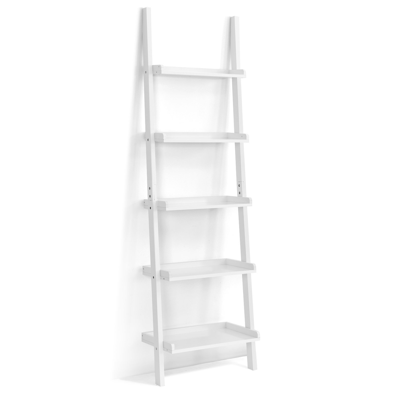 Made of solid density board, this shelf is sturdy and durable enough for long-lasting use. 5-tier open shelves can well suit your daily needs for storing and displaying books, photos, ornaments, etc. Featuring a unique and space-saving wall-leaning design, the ladder shelf can not only make full use of vertical space but also keep your room clean and tidy. Besides, the simple and modern style makes this bookshelf suitable for the living room, bathroom, and study. It can be used not only as a bookcase but also as a display rack and storage shelf.If you’re looking for a bookshelf that requires storage and can be moved anywhere easily, you should try out our 5-tier ladder shelf. Multifunctional Ladder Shelf: Thanks to the great design, our amazing ladder shelf can be used for storing, displaying, organizing or other indoor use. The 5-tire shelves design allows you to store books, display flowers or treasures, organize stuffs and so on. No matter used for home or office, it will be a perfect choice. 5-Tier Large Storage Spaces: Equipped with 5 large wood shelves with 60cm length and 30cm width, which provides plenty of storage space for your daily display interests. Also the 32cm space between each shelf ensures you to place tall stuffs and also offers more options of display combinations. Premium Wooden Materials: Constructed by premium wood frame in proper angle that provides strong stability and sturdiness. The well-made shelves along with high quality hardware provide a high weight capacity and allow it to load more books, flowers or other stuffs, also the ladder shape will make it stick tightly to wall. Attractive Home Decoration: This 5-tier wall rack have simple but generous modern design, it is suitable for your multipurpose use. You can use it on your living room, kitchen, hall, bedroom, office or anywhere you like. It can not only decorate your room, but also help you to storage a lot of things. Easy to Clean and Maintain: Designed with attractive modern wood ladder frame, which is painted with safe white varnish that without any harm to this body or environment. This rack is easy to clean and maintain after daily use. All the surfaces of the ladder shelving are smooth and keep you from getting scratch.