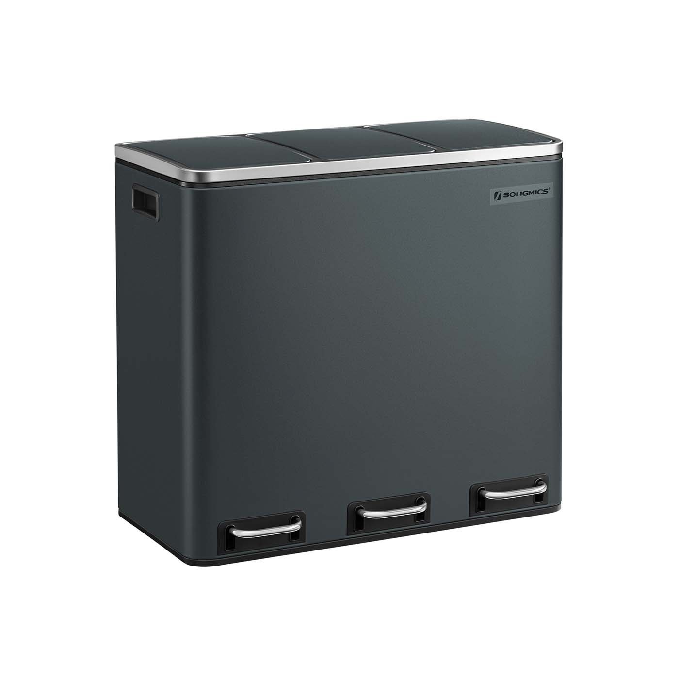 Recycling Can Be Easy: With 3 sections side by side, you can sort your recycling and trash with a simple toss. All you need to do is to step on the pedal to open the lid, and you now have your hands free to throw away your trash or recycling. Without needing to touch anything with your hands, it’s more hygienic. The 3 buckets inside have handles so that they can be easily lifted out and emptied.Puppy- and Kid-Proof: If you get tired of cleaning up the mess that your naughty husky or kid leaves you after they overturn the garbage basket, then this sturdy bin with lids is perfect for you – it can’t be opened without first using the pedal.Specifications:Colour: Smoky GreyMaterial: Steel, PP Plastic Inner Bucket, ABS Plastic LidTotal Product Size: 61.5 x 31.5 x 56 cm (L x W x H)Each Inner Bucket Size: 18 x 26.5 x 49 cm (L x W x H)Total Height with Lid Open: 84.5 cmProduct Weight: 9.1 kgPackage Contents:1 x Rubbish Bin1 x Instructions (EN, DE, FR, ES, IT)SONGMICS Notes:Wipe clean with a damp cloth and then wipe dry.