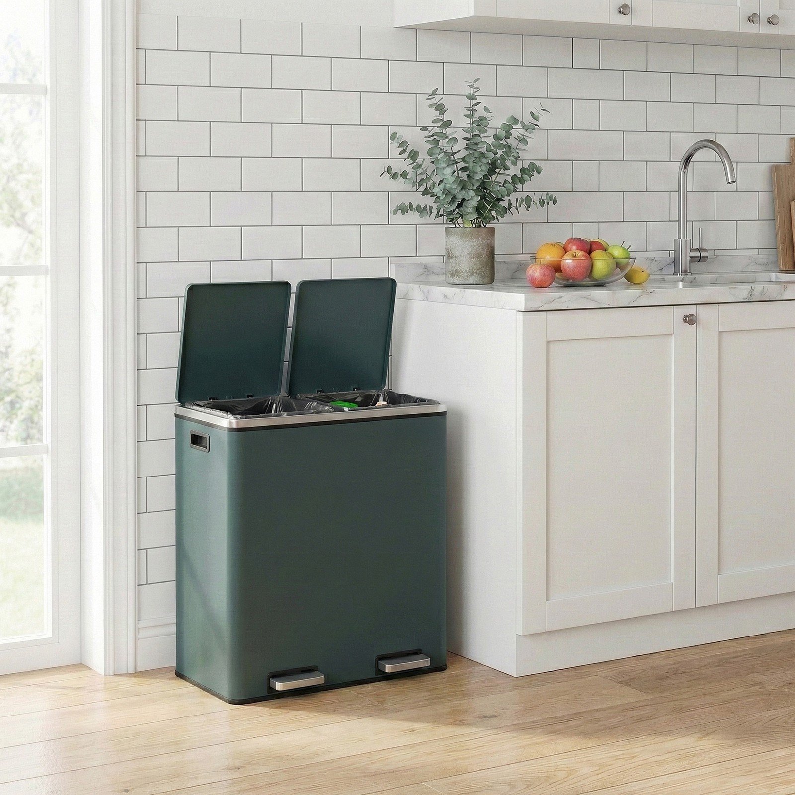 60L Dual Compartment Pedal Bin, Soft-Close Lids, Removable Buckets, Grey Kitchen Recycling Bin