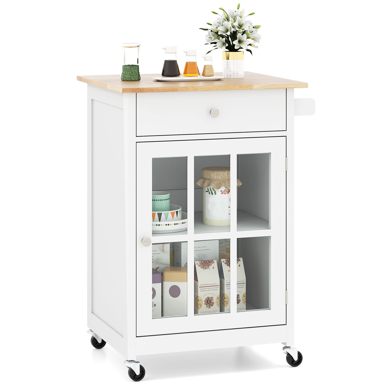 This versatile kitchen island features a smooth rubber wood top and offers smart storage solutions, including a deep drawer, a see-through cabinet, and adjustable shelving. Itās easy to move around with 4 smooth-rolling wheels (2 of which are lockable), and the side handrail doubles as a towel holder for convenient access. Whether you’re prepping ingredients, storing cookware, or serving dishes, the kitchen island cart adapts to your needs without cluttering the kitchen! Bullet Point:Rubber Wood Tabletop: The kitchen island features a spacious rubber wood tabletop, instantly expanding your workspace. The easy-to-clean wooden surface wipes down effortlessly after food preparation, helping maintain hygiene and neatness in your kitchen. Effortless Mobility & Stability: Equipped with 4 universal wheels and a side handrail, the mobile kitchen cart moves seamlessly around your kitchen. 2 of the wheels are lockable, allowing you to secure the kitchen cart where it is needed. Ample Storage Space: This kitchen utility cart comes with a deep drawer and a 2-tier cabinet with a 3-level adjustable shelf, offering flexible storage options. Additionally, the handrail serves as a convenient towel rack, keeping your towels within easy reach. Tempered Glass Door: Framed with a see-through glass door, the wheeled cabinet allows you to easily locate and access your items. Constructed with tough tempered glass, it provides long-lasting durability, ensuring that the cart withstands frequent use in a busy kitchen. Thoughtful Details: The rolling bar table is designed with thoughtful features to enhance usability. The magnetic catch keeps the door securely shut, while the round drawer knobs and smooth metal slides enables easy opening.