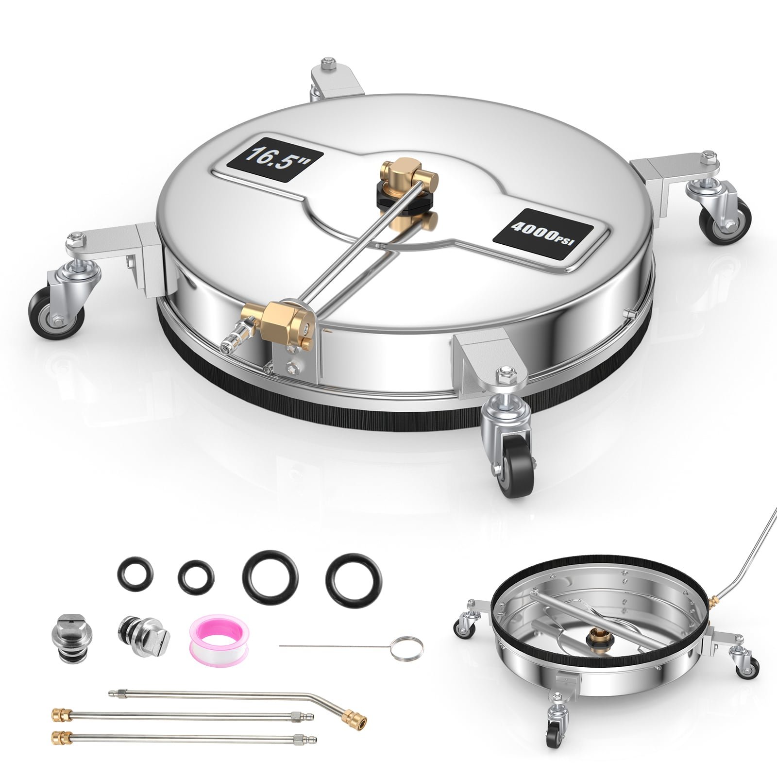 The 2-in-1 reversible surface cleaner is a versatile cleaning solution for all horizontal surfaces or even undercarriage. It comes with 360° smooth rolling casters, which can be used the opposite way with a simple 180° turn. What’s more, equipped with dual high-pressure rotating nozzles, the power washer attachment effectively removes dirt, grime, and mold, while the resilient bristle skirt avoids unpleasant splashes. Its 16.5-inch width provides 5 times more coverage than a standard nozzle, saving time and effort. It’s user-friendly and compatible with most pressure washers with a maximum pressure of 4000 PSI and a maximum flow rate of 15 LPM. The package includes additional accessories for easy connect and maintenance. Get efficient and hassle-free cleaning with the 2-in-1 reversible surface cleaner! 2-in-1 Reversible Design: The surface cleaner features 360° smooth rolling casters with reversible design, making it ideal for cleaning any horizontal surface or undercarriage. You can simply turn it by 180° to use the surface cleaner the other way. Powerful Pressure Washing: Equipped with dual high-pressure rotating nozzles and splash-free resilient bristles, the power washer attachment delivers 2 powerful stream of water that effectively removes dirt, grime, and mold, leaving your surfaces looking spotless and pristine. There’s also a built-in strainer to ensure smooth water flow. 16.5-Inch Wider Coverage: With 16.5-inch width, the high-pressure cleaner features 5X more coverage than standard nozzle, making cleaning totally effort-less and time-saving. In addition, it also allows for wide application, including cleaning pool, deck, sidewalk and driveway. Durable Stainless Steel Construction: Made from high-quality stainless steel, this pressure washer accessory is built to last. Its sturdy and durable construction ensures long-lasting performance and reliability. Easy to Use: Comes with 3 extensions wands with 1/4″ QC plug, the 16.5-inch surface cleaner is compatible with most pressure washers with 4000 PSI max pressure and 4 GPM max flow. Plus, the complete package also provides you with 4 O-rings, 2 replacement nozzles, a nozzle cleaner and a Teflon tape for easy maintenance.
