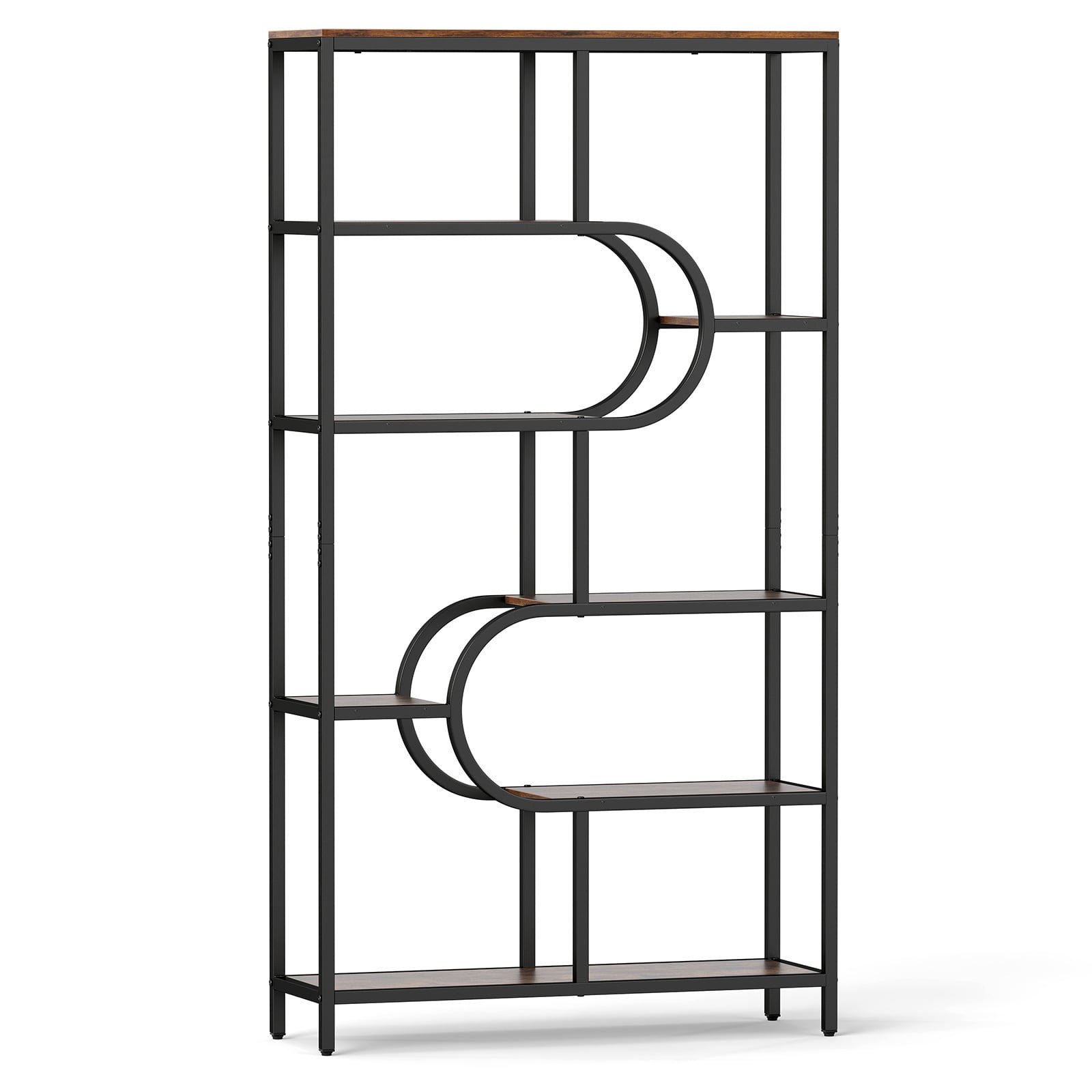 This 8-tier geometric bookshelf offers generous open shelving, perfect for neatly displaying books and decorative items. Its tiered layout optimizes vertical storage, making it a practical solution to your home. Constructed with a robust metal frame, this etagere bookcase ensures long-lasting strength and stability. Adjustable foot pads provide balance on uneven surfaces, while dual anti-toppling kits secure the unit to the wall for enhanced safety. Boasting a unique oval-shaped design, this bookshelf brings a contemporary and sophisticated flair to any room. Distinctive Geometric Bookshelf: Showcasing a sleek u-shaped/oval-shaped design, this bookshelf brings a contemporary and refined touch to your room. Its eye-catching shape creates a stylish centerpiece that blends well with interior decorations.Ample Storage & Display Space: Featuring multiple spacious shelves, this bookcase provides generous space for books, photos, handicrafts, potted plants and ornaments. Its multi-level design maximizes vertical storage while keeping items organized and accessible.Reliable Structure: Built with a powder-coated metal frame and adjustable foot pads, this corner display shelf ensures lasting strength and balanced support. Capable of holding up to 140kg, the etagere bookcase provides reliable support for your storage needs.Use with Stability and Safety: Equipped with 2 anti-toppling kits, this freestanding tall bookshelf provides added security by preventing unwanted tipping. Designed for safe and stable use, it ensures the unit remains firmly in place.Versatile Placement: This storage organizer wisely combines form and functionality. Whether used as a bookshelf in the study, a room divider in the living room, a plant stand on the balcony or a storage rack in the kitchen, this versatile piece caters to different needs.