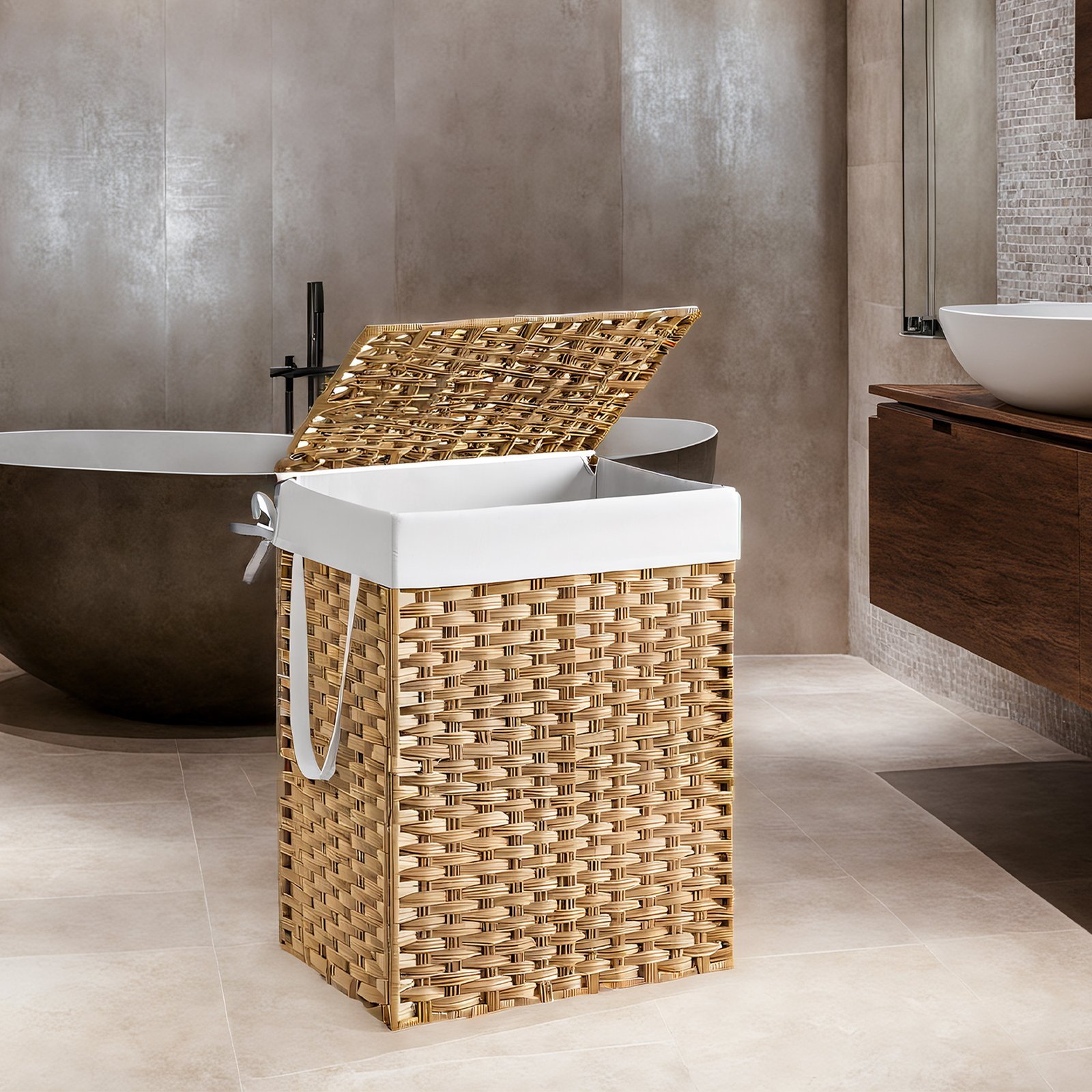 An Organised Home is a Happy HomeIt’s easy to toss your dirty clothes on the floor. But not only does it make your home look disorganised, it results in you spending more time gathering up your clothes than necessary when it comes time to wash them. With a proper laundry basket, you can put an end to messy bedrooms and welcome in a stress-free, organised sanctuary you’ll love to look at.With the 46 x 33 x 60 cm (L x W x H) SONGMICS 90L laundry hamper, you can easily toss in your dirty clothes and bring them where you want. The liner bag ties to the basket so it won’t fall to the bottom, while it still remains easy to take out and carry.Handwoven BeautyThe handwoven synthetic rattan adds a touch of class anywhere you decide to place it. Because of the quality synthetic rattan and iron frame, you won’t need to worry about rust or water damaging your clothes or hamper-even in damp rooms like the bathroom.The basket is also great for storing toys in the playroom, games in the family room, or supplies in your workshop. It supports a variety of items, up to 25 kg.Specifications:- Colour: Natural- Material: PP Plastic Rattan, Iron Tube Frame, Cotton Liner- Product Size: 46 x 33 x 60 cm (L x W x H)- Product Weight: 4 kg- Max. Static Load Capacity: 25 kgPackage Contents:- 1 x Laundry Basket- 1 x Accessories Bag- 1 x Instructions (EN, DE, FR, ES, IT)SONGMICS Notes:- Do not place any sharp objects inside that could cause damage or injury.- The maximum static load capacity is 25 kg. Please do not overload the laundry hamper.- As this product is handwoven, occasional differences in woven strip and connection joints may occur; this does not impact its use.