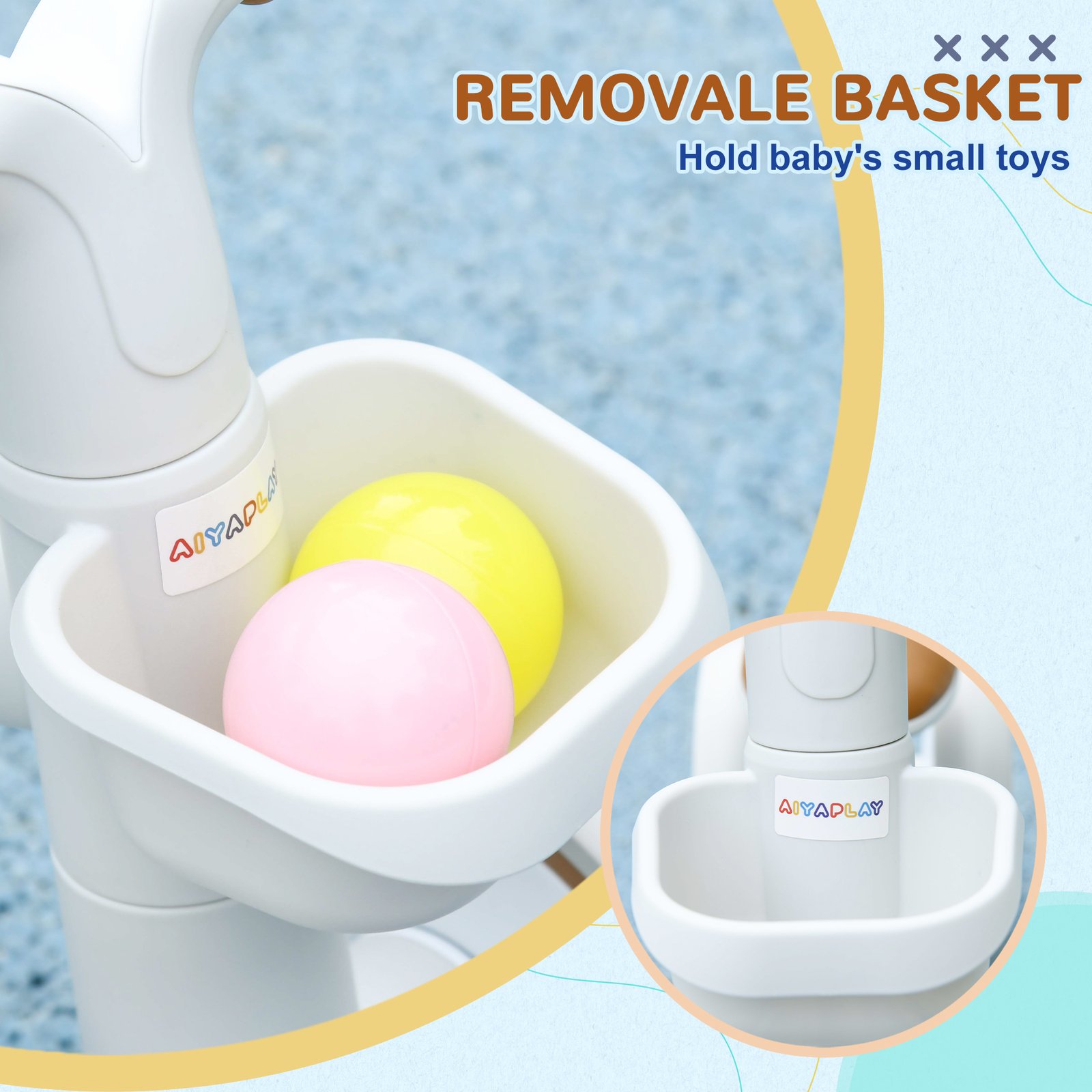 - Includes a removable basket for toys and essentials