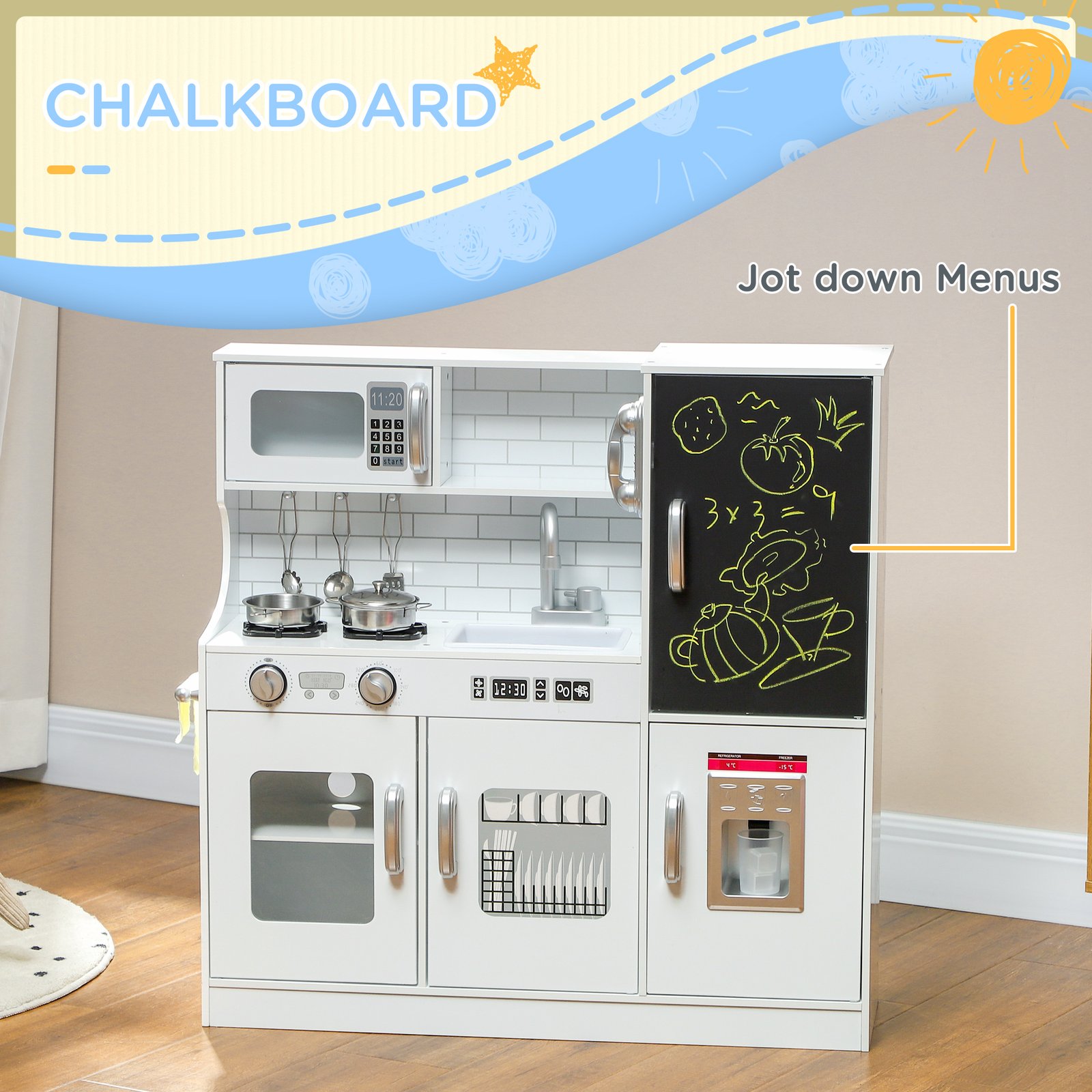 Little chefs can create delightful pretend dishes with the AIYAPLAY toy kitchen. Equipped with a chalkboard, realistic ice maker, stove and microwave, this set enhances playtime. The kitchen toy includes a five-piece stainless steel set for imaginative cooking adventures. Crafted from smooth MDF, it provides a safe play space for children aged 3-8, fostering creativity and imagination.