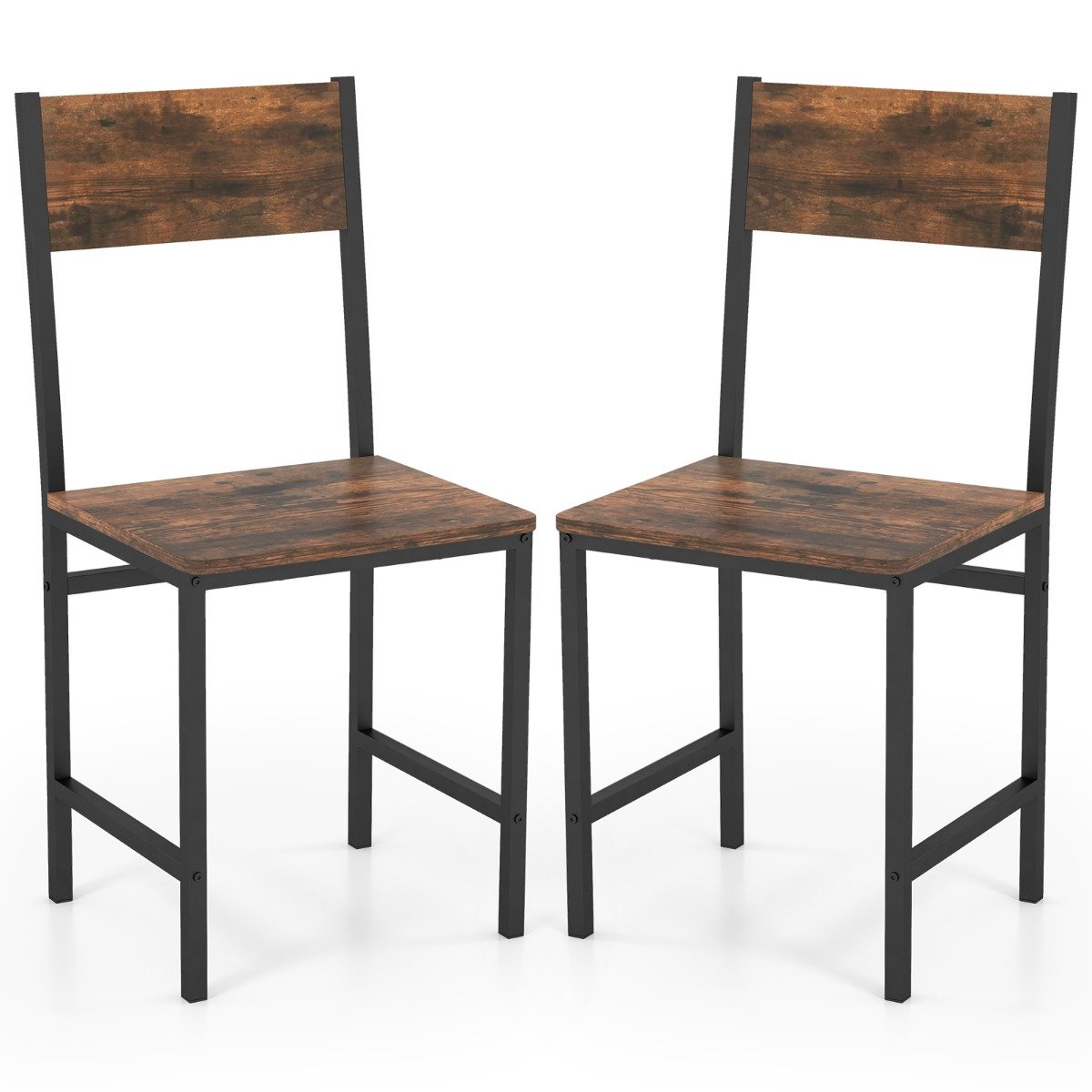 Color: Rustic Brown Material: Metal, Engineered Wood Product Dimensions: 40 x 40 x 87 cm (L x W x H) Seat Size: 40 x 36 cm (L x W) Seat Height: 47 cm Weight Capacity: 150 kg Net Weight of 2 Chairs: 9 kg Box Qty:1(May vary by batch)Package Includes: 2 x Dining Chairs 1 x Instruction Manual