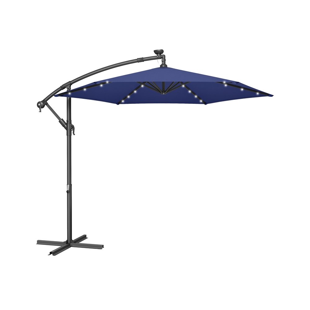 Cool by Day, Romantic by NightBrunch with friends on the terrace, a carefree afternoon with the family in your yard, a romantic dinner with your better half in the garden…this garden parasol makes every one of your ideas come true! It offers strong UV protection of UPF 50+, soft lighting thanks to 32 LED lights, and high stability in light winds. You’ll be able to enjoy the fresh air outdoors all day long!Specifications:- Colour: Navy Blue- Material: Powder-Coated Metal Pole, 180 g/m² Polyester Fabric- Canopy Diameter: 3 m- Height: 2.45 m- Product Weight: 14.1 kgPackage Contents:- 1 x Solar Cantilever Parasol- 1 x Solar Panel- 1 x Cross Base- 1 x InstructionsSONGMICS Notes:- Add weights of 70-90 kg (not included) to your existing umbrella stand to enhance overall stability.- Do not open the umbrella with force, the crank mechanism needs a slow and light opening.- Close the parasol during nights, windy or rainy days to avoid damage to the product.