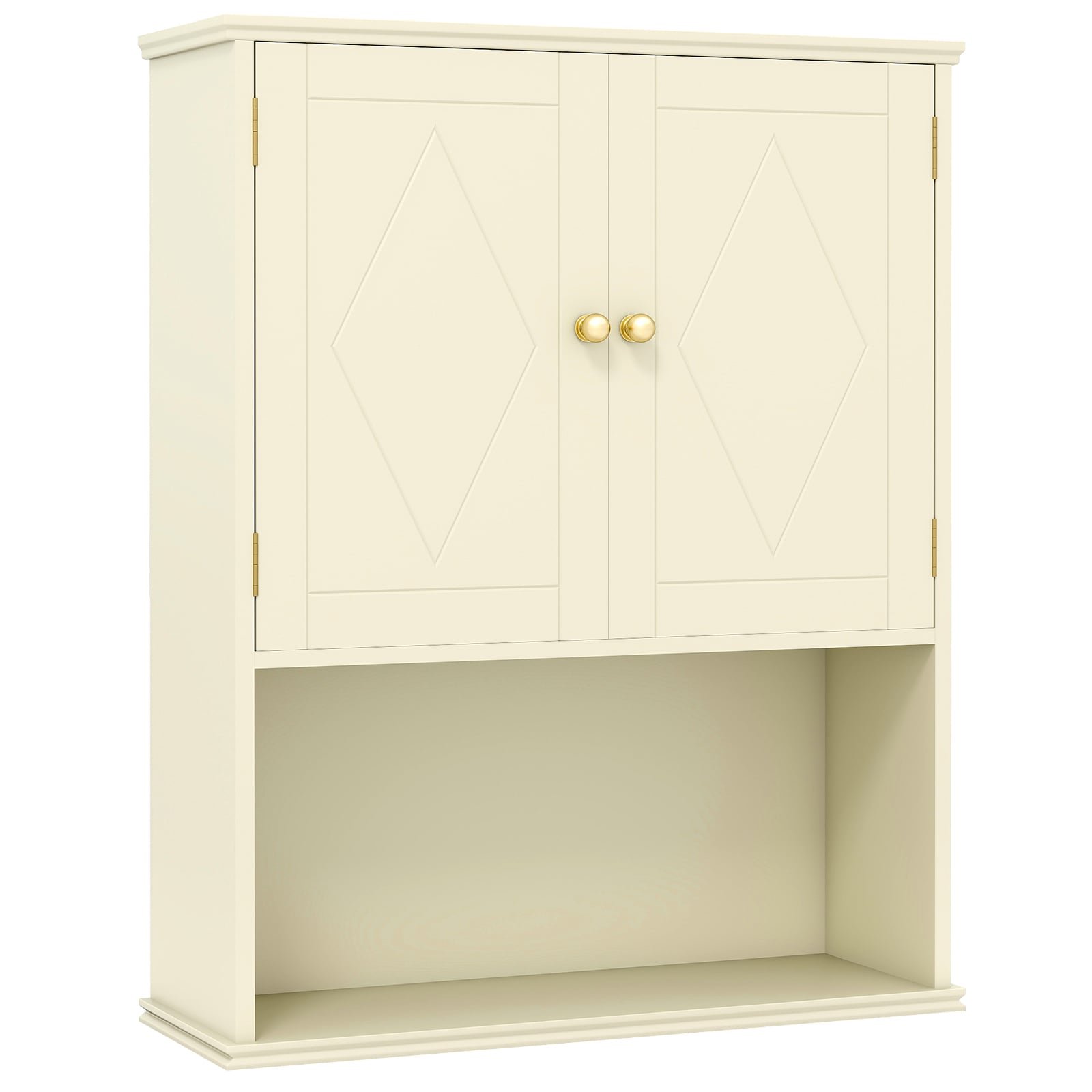 This 2-door bathroom wall cabinet provides practical storage without occupying the valuable floor area. It features a 3-position adjustable shelf inside, allowing you to customize the interior space to store various items such as toiletries, towels, skincare products or cleaning supplies. The cabinet doors feature a magnetic catch that securely shuts to keep contents protected and neatly hidden away. Below the enclosed section, an open shelf offers easy access for often-used items. Crafted for versatility, this medicine cabinet is ideal for bathrooms, kitchens or laundry rooms. Bullet Point: Large Storage Space: This double door wall cabinet keeps your essentials organized and hidden for a clutter-free bathroom. The lower open shelf gives you quick access to your most-used items or offers additional display space for decorations. Removable and Adjustable Shelf: Equipped with a 3-postion adjustable and removable shelf, this bathroom wall cabinet allows you to easily customize storage space for items of different sizes. Space-saving Wall Cabinet: This wall mounted medicine cabinet maximizes vertical storage potential in underutilized areas, transforming wasted wall space into functional storage to meet various needs. Modern and Multipurpose Design: Featuring diamond-shaped door panels and golden round handles, this wall mounted storage cabinet adds a modern charm to your space. It is ideal for various occasions, such as the bathroom, kitchen, laundry, entryway. Exquisite Workmanship: This 2-door bathroom wall cabinet comes with a magnetic catch that ensures secure door closure every time. The premium metal hinges offer long-lasting use, while the easy-to-clean surface makes maintenance effortless.