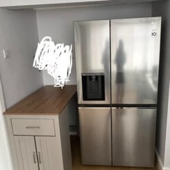 Humanized and Thoughtful Details: There is enough room to hold a stool on each side, which can be tucked under the table to save floor space when not in use. What’s more, the convenient handles provide you with great convenience while the considerate door catch helps close the doors firmly.