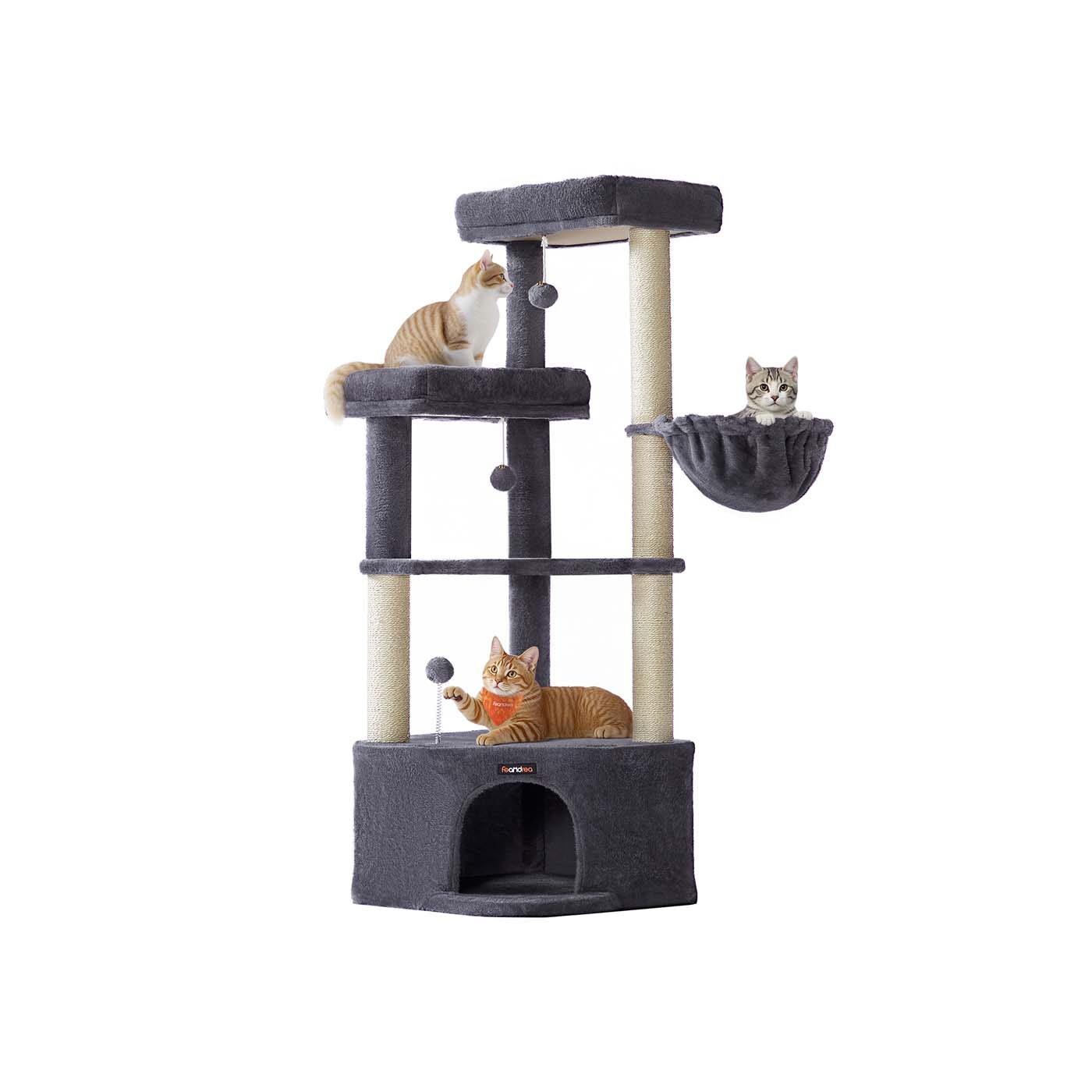 Feandrea Cat Tree Tower, 48.5 x 48.5 x 140.7 cm, Cat Condo with Large Cave, Large Perches, Scratching Posts, Pompoms, Basket, Dove Grey PCT009G01