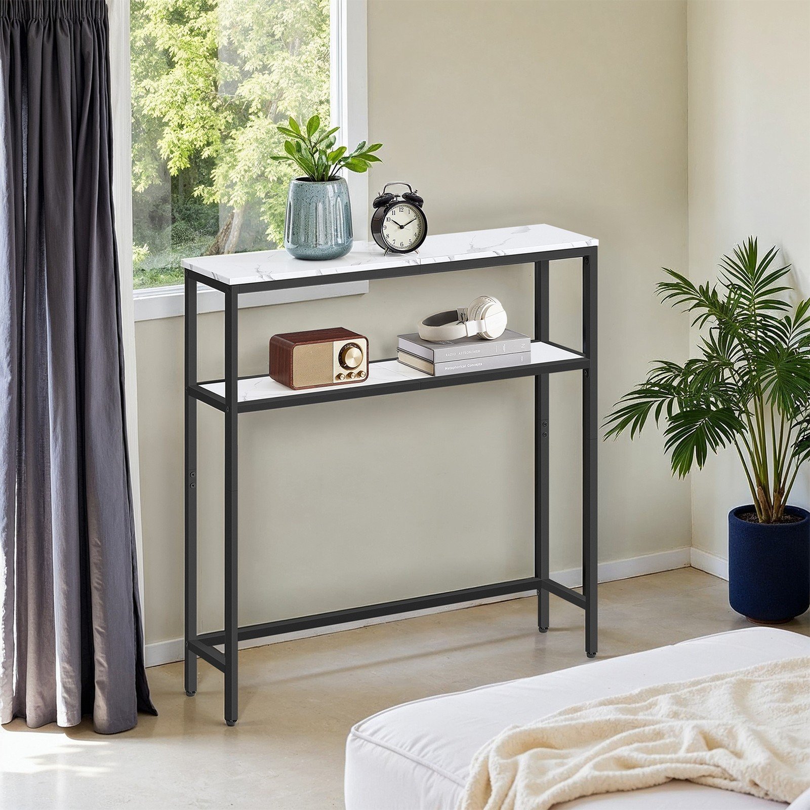VASAGLE Console Table for Hallway, 2-Tier Slim Sofa Table, 20 x 120 x 80 cm, Hallway Table with 2 Shelves, for Living Room, Bedroom, Marble White and Ink Black LNT133W59