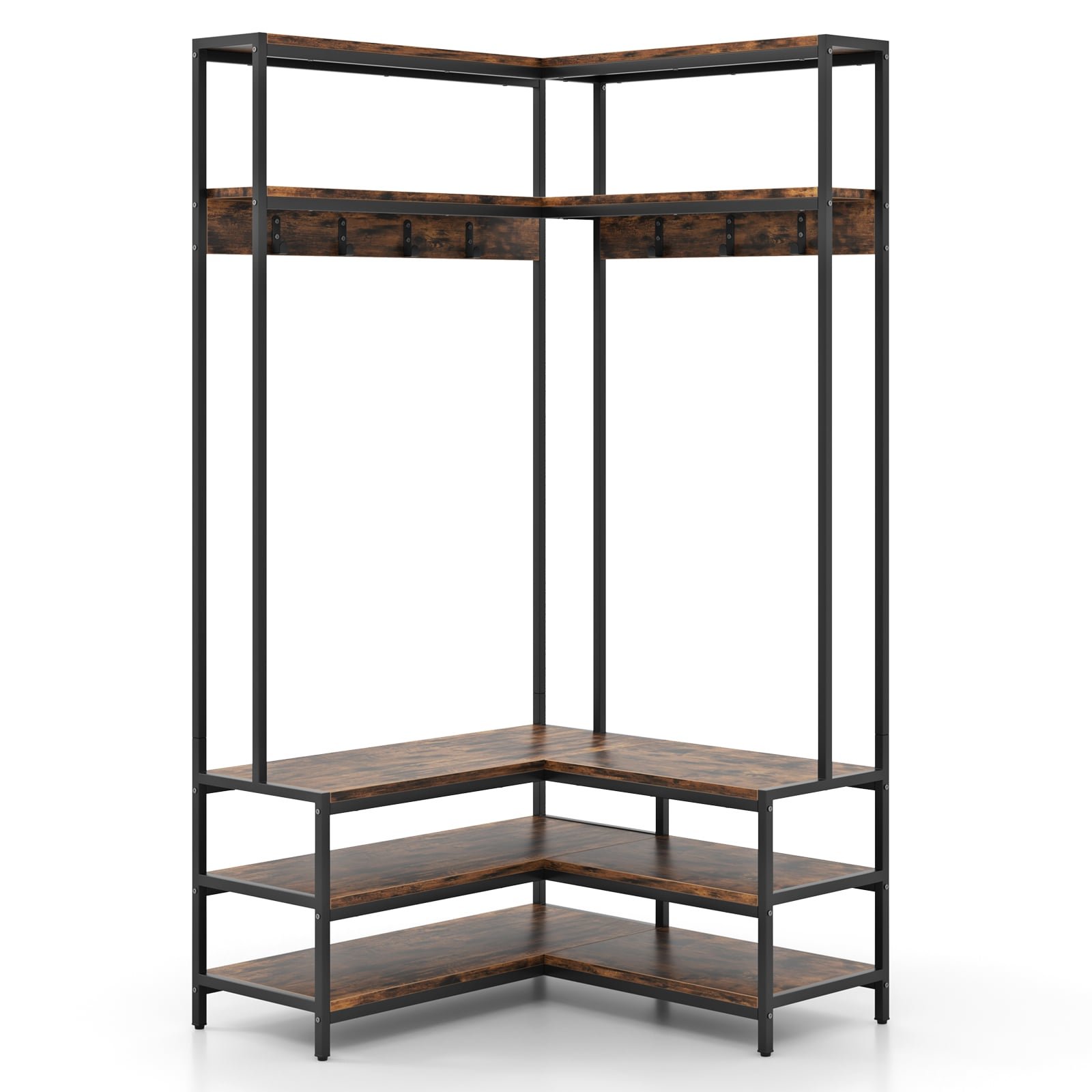 L-shaped Clothes Corner Garment Rack with Open Shelves and 7 Hooks-Rustic Brown