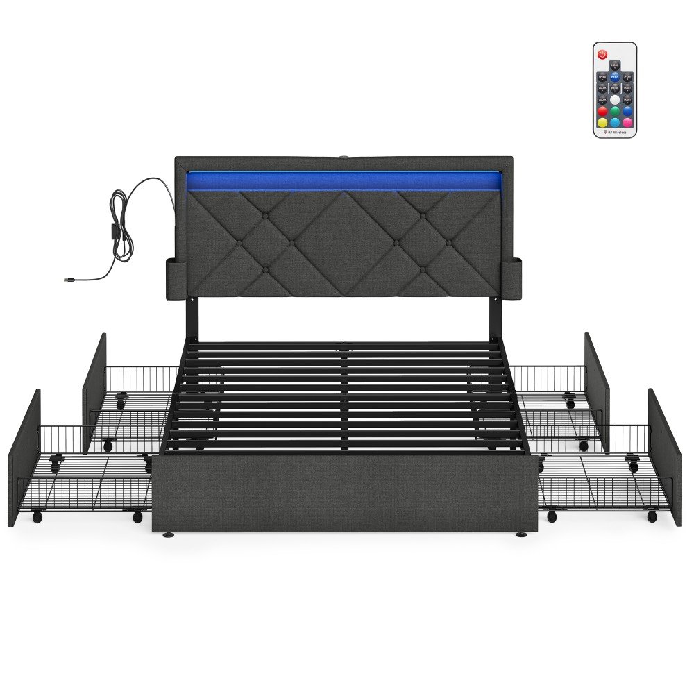 Double Bed Frame with LED Lights and Underbed Storage Drawers Slate Grey
