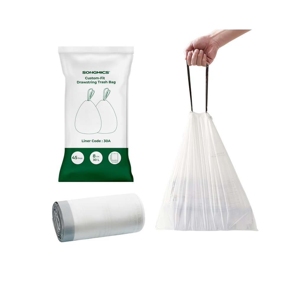 Fits Like a Glove: Feel dizzy looking for bags to fit your bin? Here comes the right answer! These garbage bags are specially designed for your SONGMICS 60L double trash can and are made to fit.How do these bags make your life easier in the kitchen?Designed for SONGMICS 60L double trash cans, they fit snugly and firmly.The right size prevents them from slipping or accumulating on the edge.The practical handles make it easy to close and carry the bags.Both bags and handles are made of robust HDPE for tear-resistance.With thick material and fine seams, they boast great tightness and a high load capacity.The bags are odourless and friendly to sensitive noses.Product Details:Colour: WhiteMaterial: HDPE (High Density Polyethylene)Size of Each Bag: 52 x 74 cm (L x H)Size of the Roll: 8 x 23 cm (Dia. x H)Capacity of Each Bag: 30LTotal Weight: 0.8 kgPackage Contents:1 x Roll of Trash Bags (45 Pieces)SONGMICS Notes:Keep the product away from children and pets to avoid potential injury such as suffocation.It is not recommended to use the product for food storage.Keep the product away from heat sources.