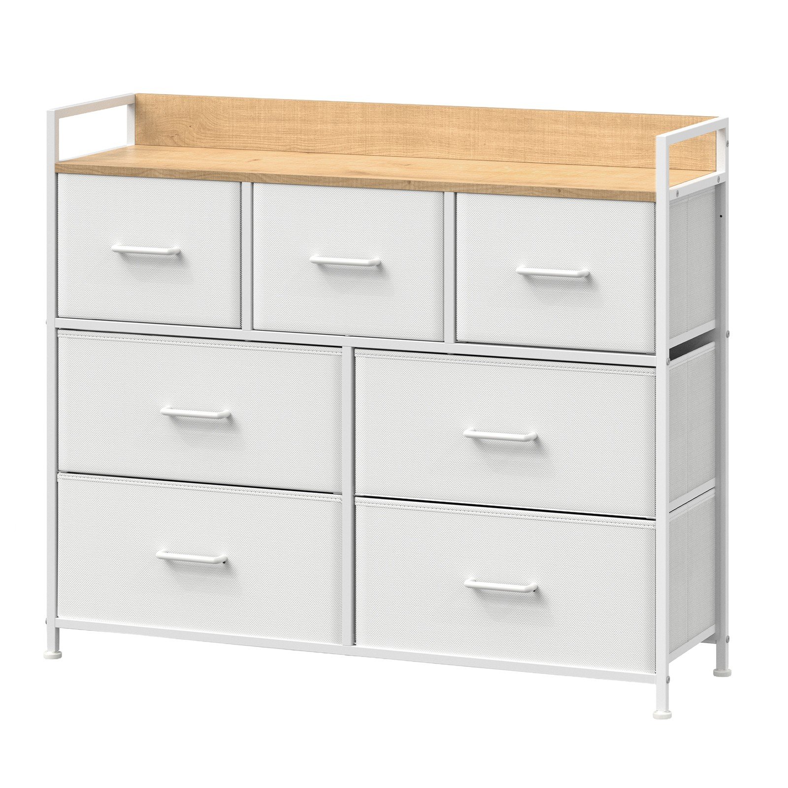 Dresser Cabinet with 7 Fabric Drawers, Metal Frame, Storage Organizer for Bedroom, White and Beige