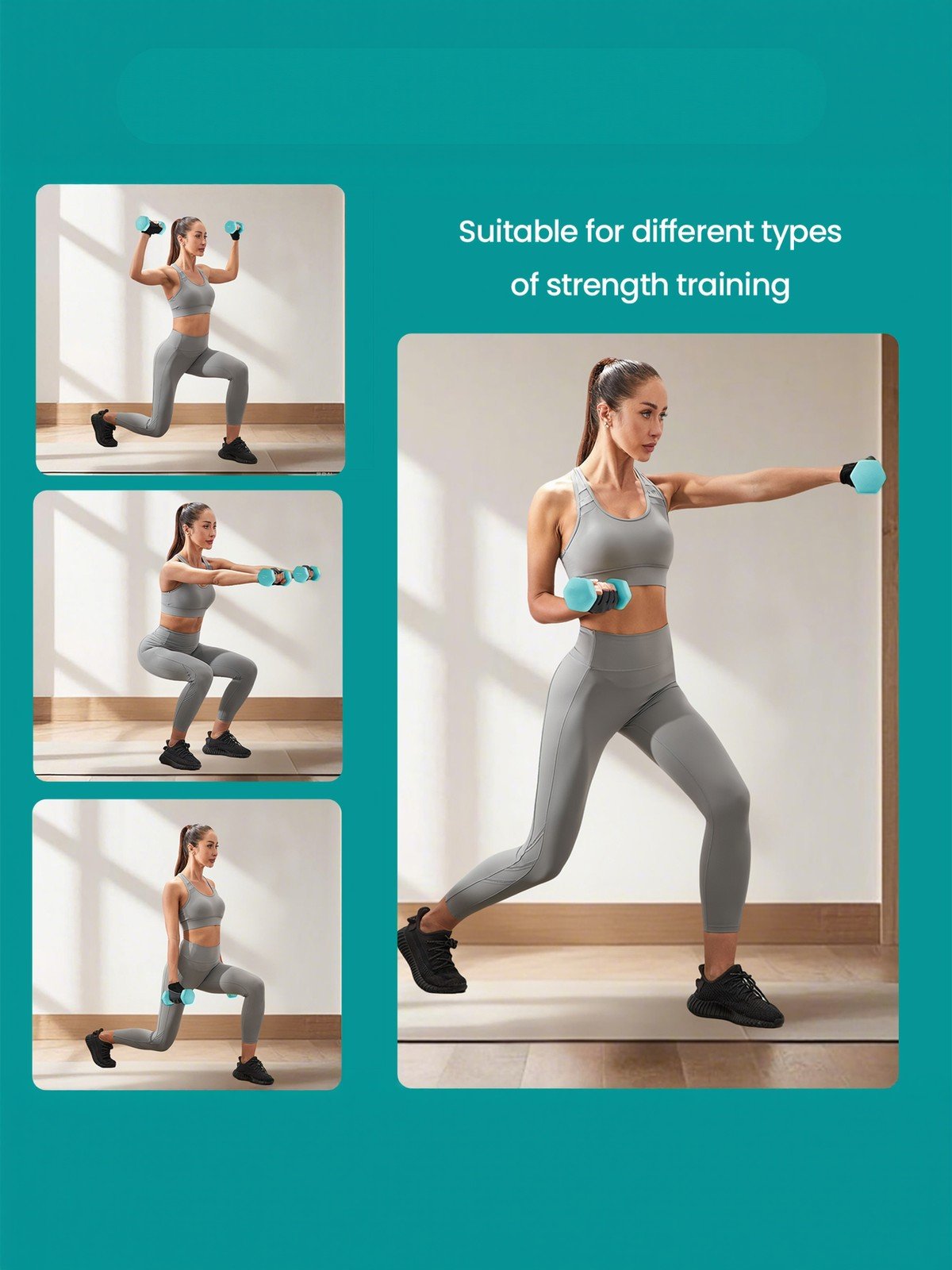 Enhancement! Girls! Enhancement!If you’re a woman just getting started with lifting weights or are about to go on a regular fitness plan, you won’t regret this. Adding weight training to your exercise routine with this coloured dumbbell set in pink, aqua, and blue is like adding ice cream to a warm brownie, flavoured cream to coffee, or yoga pants to your wardrobe. No more guilt from not working out from now!Smart Combination, Lightweight Set!With dumbbells that are too heavy, you’ll miss out on a range of worthy exercises that you can complete with these light-weight beauties, letting you train and strengthen your muscles for more reps. A 12 kg set can do the trick, but this weight set of 1 kg, 2 kg, and 3 kg is a big hit for beginners or those looking to lose weight or build strength in the arms and shoulders or work your core, thighs, and glutes in squats.An At-Home Enjoyment Experience!Featuring select solid cast iron inside with soft-to-the-touch rubber coating for a secure hold on the outside, this weight set comes with a sturdy rack and offers a great full-body workout for muscle strength and toning exercises. It only takes a small amount of space in your home!Specifications:Colour: Pink, Aqua, and BlueMaterial: Cast Iron with Neoprene CoatingProduct Weight: 2 x 1 kg, 2 x 2 kg, 2 x 3 kgPackage Contents:6 x Dumbbell1 x PP Plastic StandSONGMICS Notes:Do not put these dumbbells at a high place when not in use.Children are not allowed to play with the product.Gently put down to prevent hurting your feet.