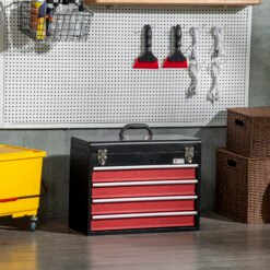 - Features four drawers and top compartment – space for a variety of tools and hardware