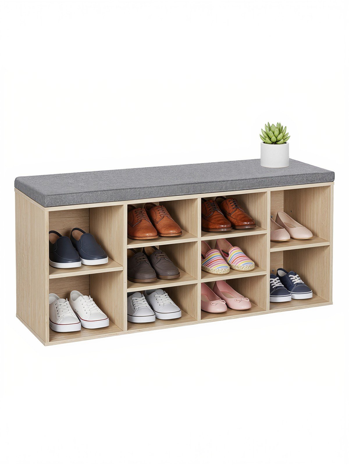 Entryway Storage Bench with Cushion, 10-Compartment Shoe Organizer, 104 x 30 x 48 cm, Oak Colour