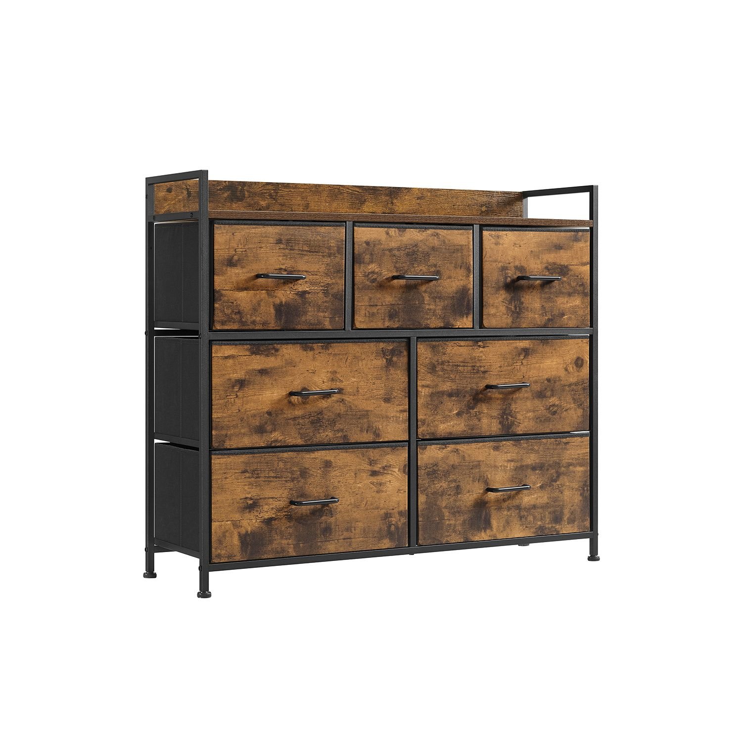 Restore the Cleanliness of Home: By having this chest of drawers, you won’t be helpless with personal belongings lying all over the place; the 7 drawers will be your powerful organisation assistants that bring back the order of your home.Multi-Material Mix: When the fabric sides of the drawer meet the MDF board on its front and bottom, when MDF table top and back panels meet the metal frame, wham! A stable and sturdy chest of drawers appears, and it can also be conveniently lifted and moved.Specifications:Color: Rustic Brown, Ink BlackMaterial: Particleboard Top, Steel, Fabric Drawer FrontProduct Size: 98 x 28.5 x 85 cm (L x W x H)Size of Each Small Drawer: 10.8″D x 11.6″W x 8.5″H (27.4 x 29.5 x 21.6 cm)Size of Each Large Drawer: 10.8″D x 18.1″W x 8.5″H (27.4 x 46 x 21.6 cm)Product Weight: 28.2 lb (12.8 kg)Max. Total Static Load Capacity: 156.5 lb (71 kg)Max. Static Load Capacity per Drawer: 6.6 lb (3 kg)Package Contents:1 x Chest of Drawers1 x Accessory Kit1 x InstructionsSONGMICS Notes:Do not put overweight items in the drawers.Do not wash the drawers. Clean with a wet cloth.There may be a smell of “new” when first opening the package; please air the product out in a well-ventilated place for a few hours.Attach the product to the wall with the anti-tip kit included for safe use.