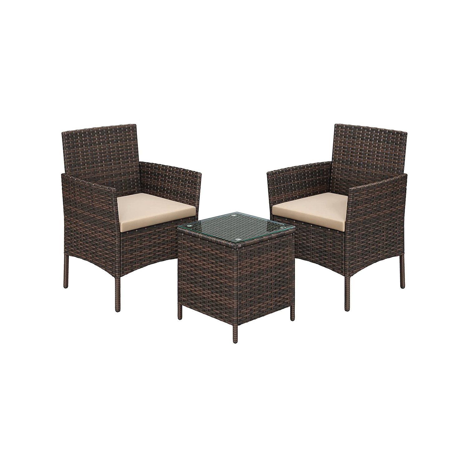 Enjoy the sunset every day in the open air with your sweetheart thanks to this set of 3 SONGMICS garden furniture pieces! What could be better than ending the day like this? Make Yourself Comfortable: Say goodbye to narrow, cramped chairs! With outwardly curved armrests and a slightly inclined backrest that forms a 90° angle with the seat, the chairs in this garden furniture set adapt to the shape of your body to support you comfortably. Enjoy Leisure Time Outdoors: Set the garden furniture set in the garden or yard to make it a relaxing spot. You can read a book on a lazy afternoon, chat with your friend under a little shade, or enjoy a pleasant summer breeze poolside. All can happen with this set of patio furniture!Specifications:- Colour: Brown, Taupe- Furniture Material: Galvanised Iron Frame, Polyrattan PE, Tempered Glass- Cushion Material: VFT (Vertical Fibre Technology) Padding, Polyester Fabric Cover- Chair Size: 49 x 56.5 x 81.5 cm (L x W x H)- Table Size: 40 x 40 x 45.5 cm (L x W x H)- Total Product Weight: 16.3 kg- Max. Static Load Capacity per Chair: 150 kg- Max. Static Load Capacity of the Table: 30 kgPackage Contents:- 2 x Chair- 1 x Side Table- 2 x Cushion- 1 x Accessory Kit- 1 x InstructionsSONGMICS Notes:- To ensure the longevity of the product, it is recommended to cover it during bad weather or winter.- To extend the lifespan of the product, please clean it with a damp cloth only.- For safe use, please do not overload it.- During assembly, first loosely align all screws with the corresponding pre-drilled holes, then tighten the screws one by one.- If the product wobbles, adjust the screws as necessary to stabilize it.