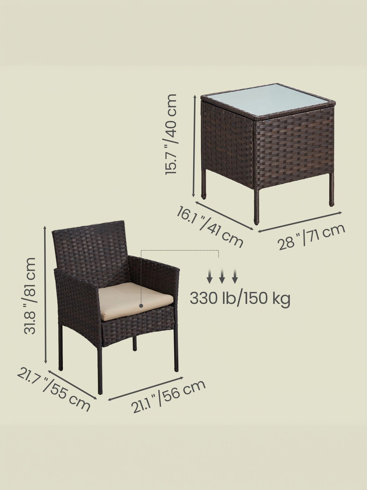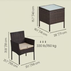 Enjoy the sunset every day in the open air with your sweetheart thanks to this set of 3 SONGMICS garden furniture pieces! What could be better than ending the day like this? Make Yourself Comfortable: Say goodbye to narrow, cramped chairs! With outwardly curved armrests and a slightly inclined backrest that forms a 90° angle with the seat, the chairs in this garden furniture set adapt to the shape of your body to support you comfortably. Enjoy Leisure Time Outdoors: Set the garden furniture set in the garden or yard to make it a relaxing spot. You can read a book on a lazy afternoon, chat with your friend under a little shade, or enjoy a pleasant summer breeze poolside. All can happen with this set of patio furniture!Specifications:- Colour: Brown, Taupe- Furniture Material: Galvanised Iron Frame, Polyrattan PE, Tempered Glass- Cushion Material: VFT (Vertical Fibre Technology) Padding, Polyester Fabric Cover- Chair Size: 49 x 56.5 x 81.5 cm (L x W x H)- Table Size: 40 x 40 x 45.5 cm (L x W x H)- Total Product Weight: 16.3 kg- Max. Static Load Capacity per Chair: 150 kg- Max. Static Load Capacity of the Table: 30 kgPackage Contents:- 2 x Chair- 1 x Side Table- 2 x Cushion- 1 x Accessory Kit- 1 x InstructionsSONGMICS Notes:- To ensure the longevity of the product, it is recommended to cover it during bad weather or winter.- To extend the lifespan of the product, please clean it with a damp cloth only.- For safe use, please do not overload it.- During assembly, first loosely align all screws with the corresponding pre-drilled holes, then tighten the screws one by one.- If the product wobbles, adjust the screws as necessary to stabilize it.