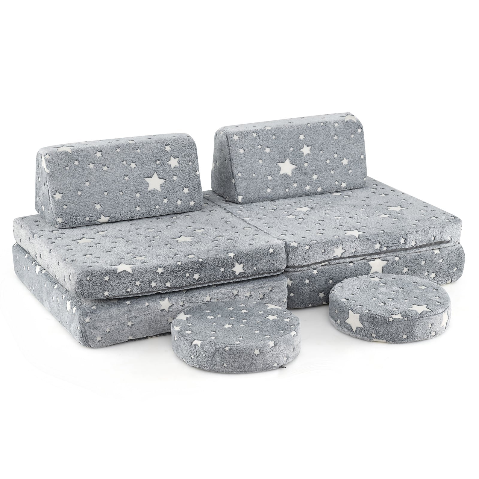 Glow in the Dark Modular Kids Play Couch Set with Machine-washable Flannel Covers and Portable Handles-Grey
