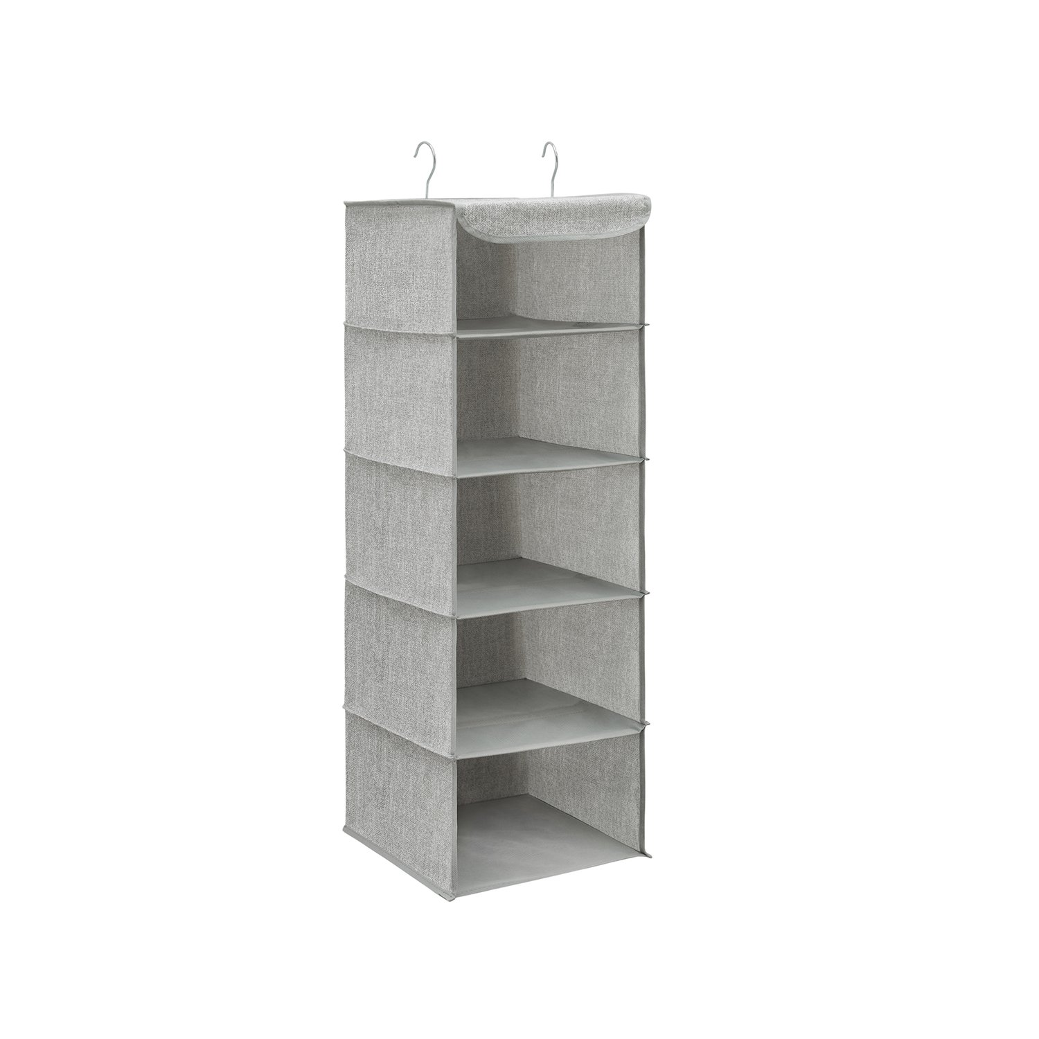Tired of endlessly digging through your closet to find your little black dress for date night? Shape up your messy closet and maximise your space with this 5-shelf clothes hanging organiser for sweaters, dress shirts, jeans, handbags, toys, shoes, accessories, and more. Bang-For-Your-Buck Clothes Organiser Using vertical space to organise your neatly folded clothes, everything will be easy to see and access. With bamboo inserts sewn in the shelves to support the loads, you will never see an ugly picture of sagging shelves. The linen patterned light grey shade blends easily into any space, kid’s wardrobe or a guest room.Specifications:- Colour: Light Grey- Material: 80 g/㎡ Non-Woven Fabric, Bamboo Insert, Metal Top Frame and Hook, 2 mm Thick Cardboard- Product Size: 30 x 30 x 90 cm (L x W x H)- Product Weight: 460 g- Max. Total Static Load Capacity: 10 kg- Max. Static Load Capacity of Each Shelf: 2 kgPackage Contents:- 1 x Clothes Hanging OrganiserSONGMICS Notes:- Do not wash with water; wipe with a damp cloth to clean.- Do not touch the product with sharp objects or put items exceeding the total weight limit of 10 kg.