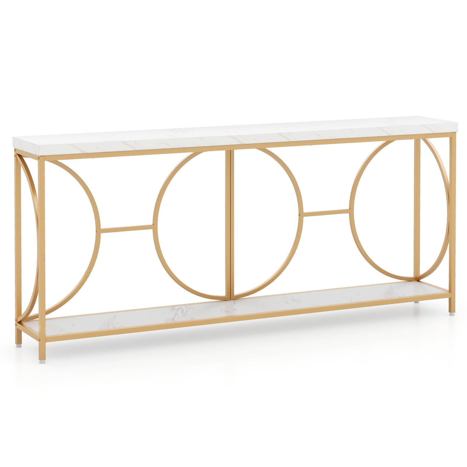 Featuring a sophisticated metal frame and an elegant tabletop with faux marble grain, this piece adds a touch of elegance to any room. Crafted with heavy-duty metal, it ensures structural stability and durability. The powder-coated finish provides excellent rust-resistance, while the adjustable foot pads offer enhanced balance. With its spacious 2-tier design, this side table provides ample storage for your decorative items, photo frames, flowers, and personal belongings. Safety is a priority, as it includes two anti-tipping devices that can secure the console table to the wall to protect your family. Moreover, assembly is a breeze with the detailed instruction manual, and the smooth surface makes cleaning effortless. Practical and versatile, this side table is the perfect addition that will bring stylish glamour to your home. Elegant Appearance: Elevate your home decoration with this modern faux marble console table featuring a stunning golden metal frame that exudes luxury and sophistication. Moreover, the faux marble top adds a touch of elegance that complements various room styles seamlessly. Premium Quality Construction: Crafted with selected heavy-duty metal, this solid entryway table ensures structural stability. With powder coating, it also provides excellent rust-resistance. The adjustable foot pads are included for improved balance, making this side table a reliable choice. Spacious Storage Solution: With a large 2-tier design, this sofa side table offers ample space for you! The spacious tabletop and extra shelf can easily hold your decorative items, photo frames, flowers, and other personal belongings. Stay organized with this functional furniture piece! Safety Features for Families: Designed with safety in mind, this side table is child and pet friendly. Two anti-tipping devices are integrated to prevent accidents and ensure a secure environment for your loved ones, giving you peace of mind. Quicker Assembly and Maintenance: For your great convenience and a quick setup, a detailed instruction manual and all necessary accessories are included. What’s more, the smooth surface makes cleaning effortless, adding practicality to the table’s charm.