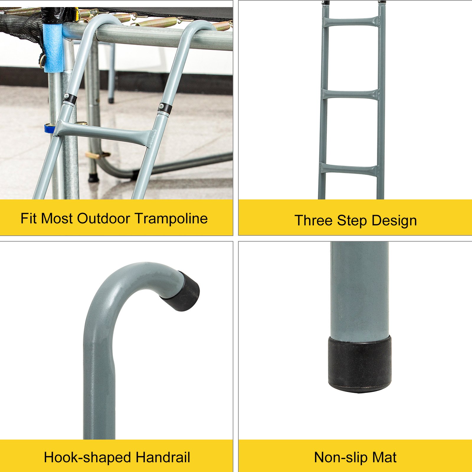 The Zinc coated ladder is manufactured by hard wearing steel. This three-step ladder fits 12FT,14FT trampolines.