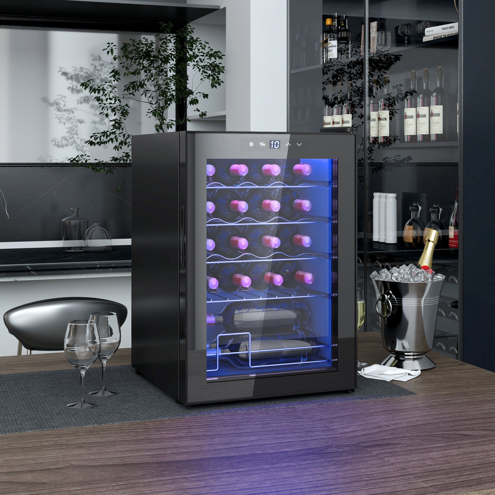 Your delicious wine collection, kept chilled and illuminated beautifully in this HOMCOM wine cooler fridge. The 20-bottle design is perfect for everyone, whether you’re the novice or the expert; look to the 5-18°C adjustable temperature to set it however cold you desire. Inside there are plenty of lights to illuminate so you can see inside properly. To adjust the temperature and lights of this small wine fridge, all you have to do is use the front touch panel.