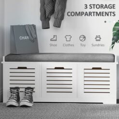 Give your shoes somewhere proud to stand with this storage unit from HOMCOM. Its design is made of three compartments for lots of holding space, with a flat cushioned top so you are able to sit on it. Made from MDF, the frame is tough and reliable for everyday use. Using sponge for the cushion for comfort, it is wrapped in linen so it is smooth and easy to wipe clean. The slatted doors of the compartments allow fresh air to circulate through, with low corner feet elevating the unit to finish.