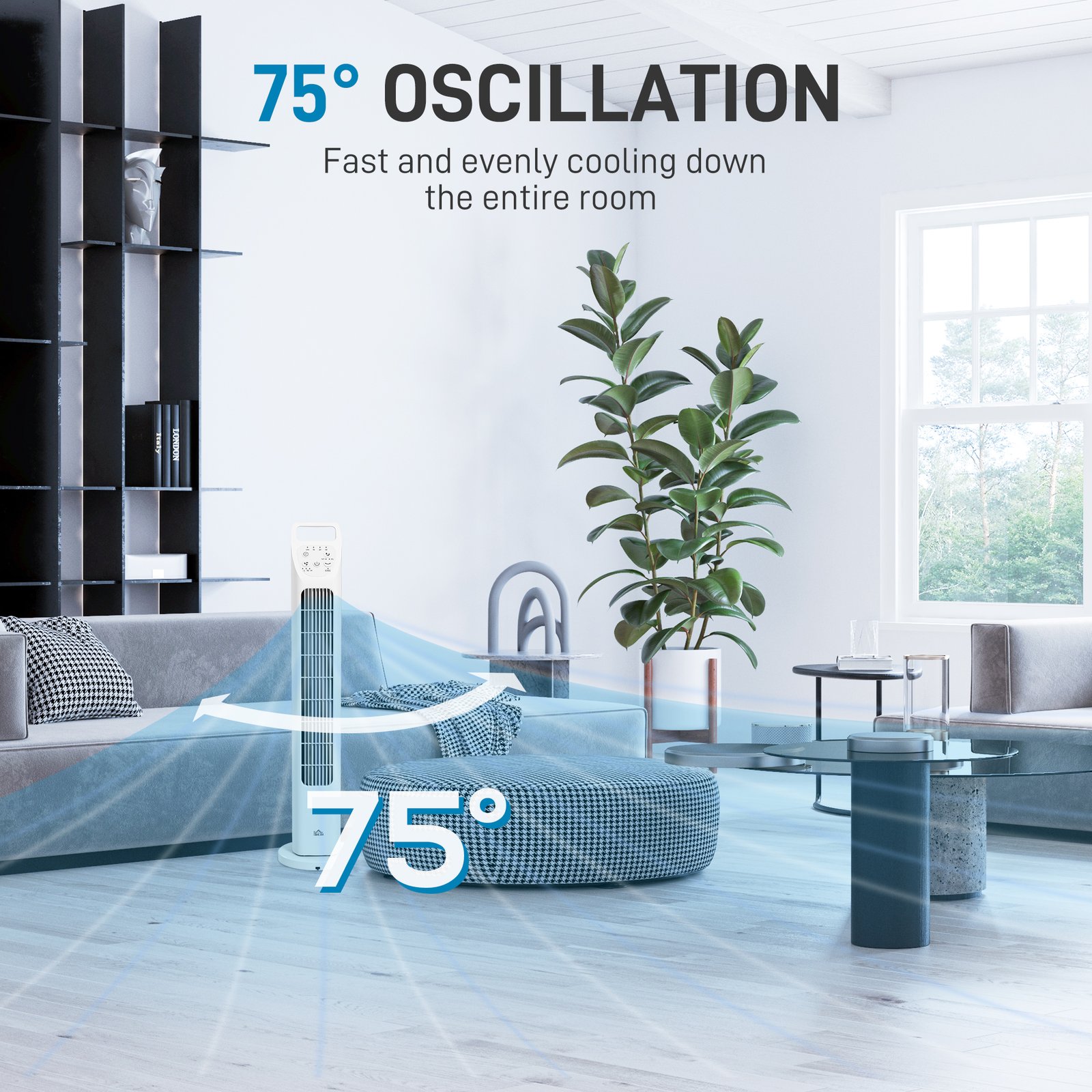 - 75-degree oscillation movement covers a greater area